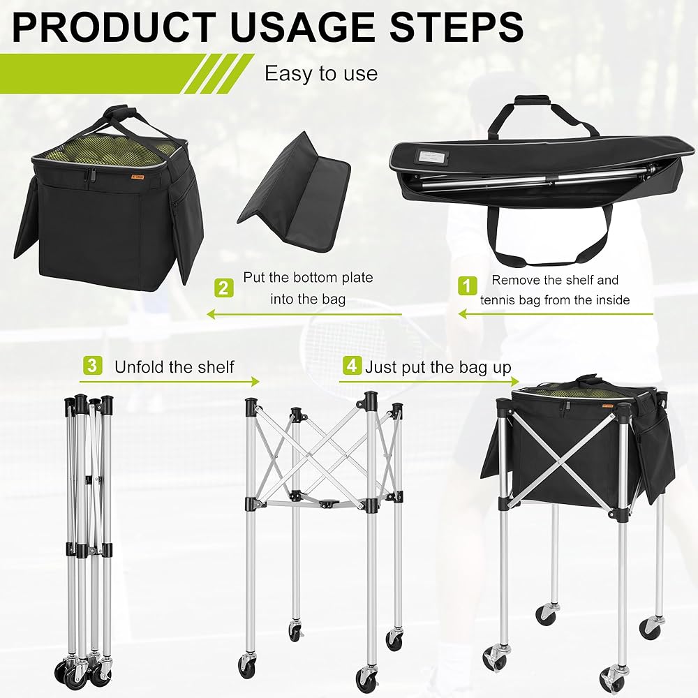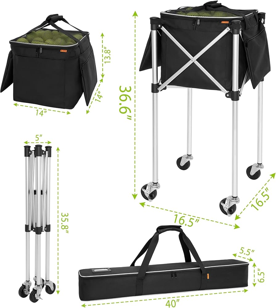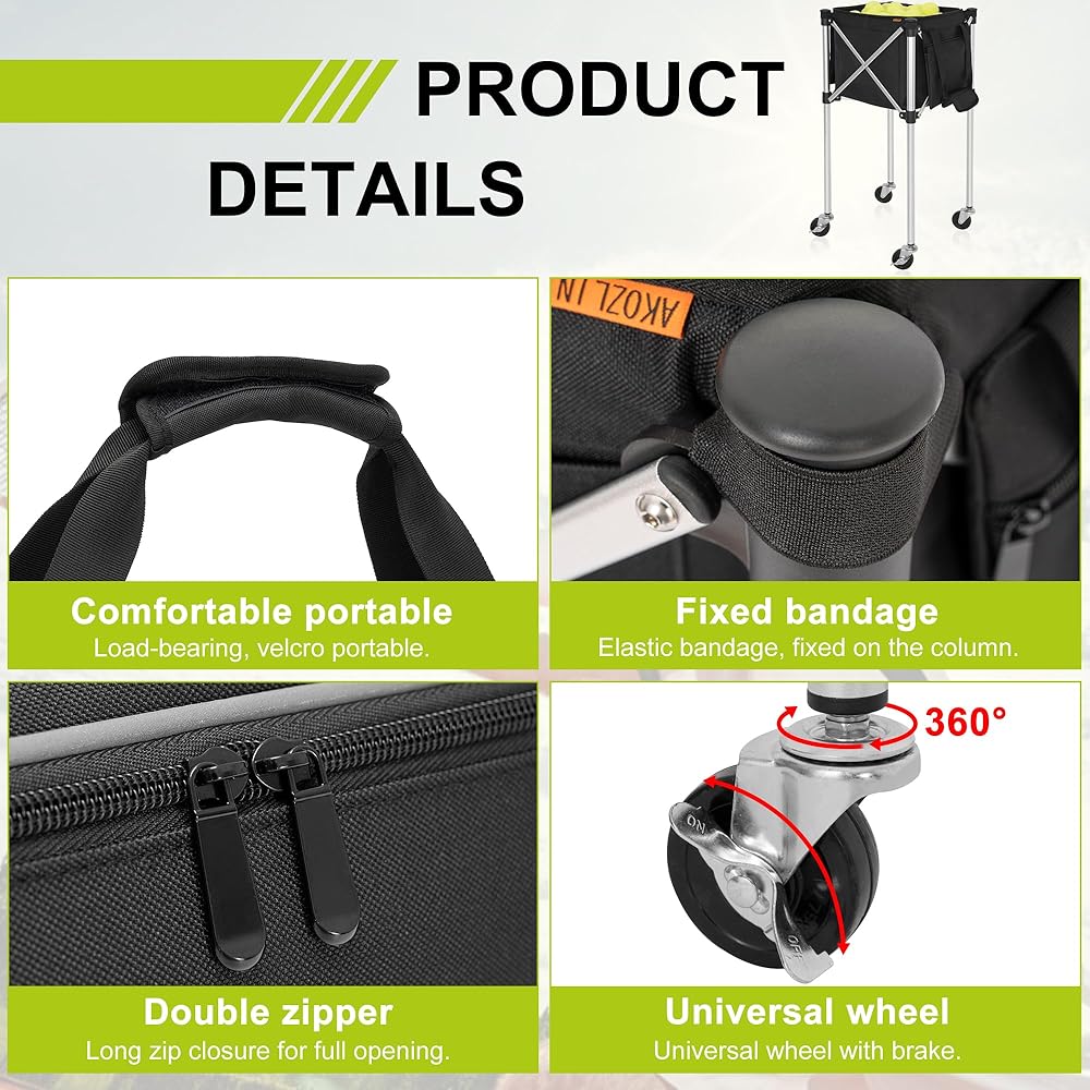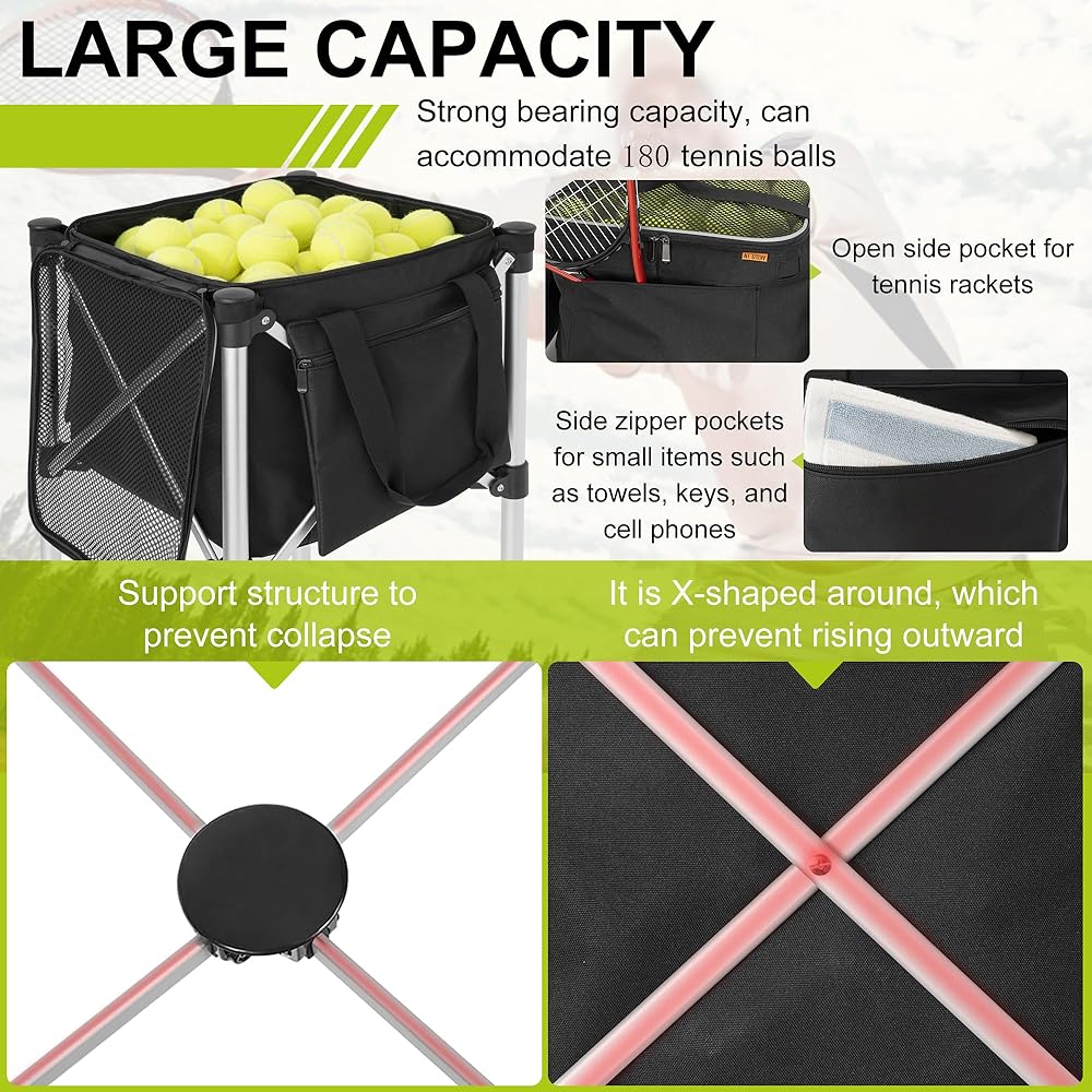 • 【مادة شديدة التحمل】- تم تصميم عربة كرة التنس لتكون قوية ومتينة، ويمكنها حمل ما يصل إلى 150-180 كرة تنس. حجم حقيبة الكرات هو 14 بوصة × 14 بوصة × 13.8 بوصة.