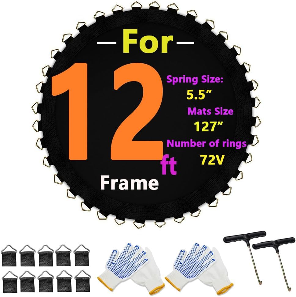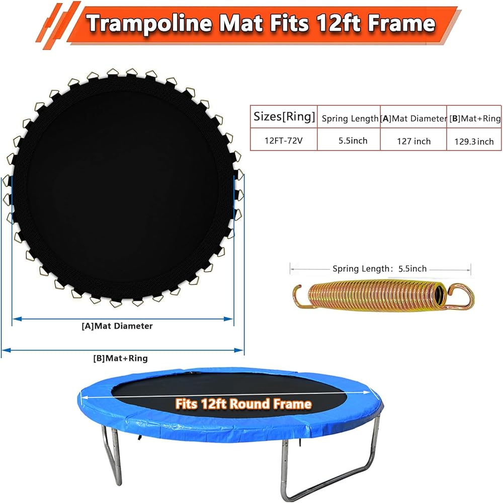 Durable Construction: This 12 ft trampoline mat replacement is designed with high-quality materials to withstand heavy use and outdoor conditions. Mat width: 127 inches; with 72 Rings. Note: Excluding frame and springs.