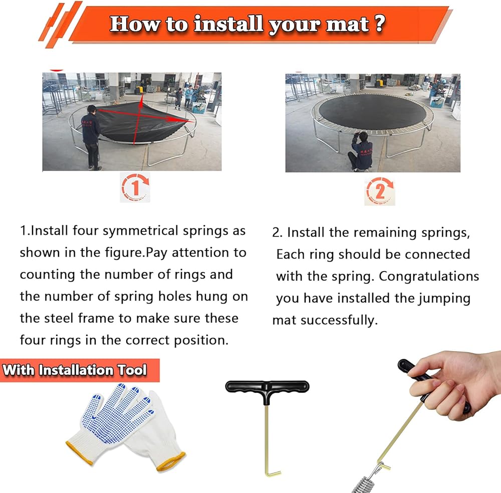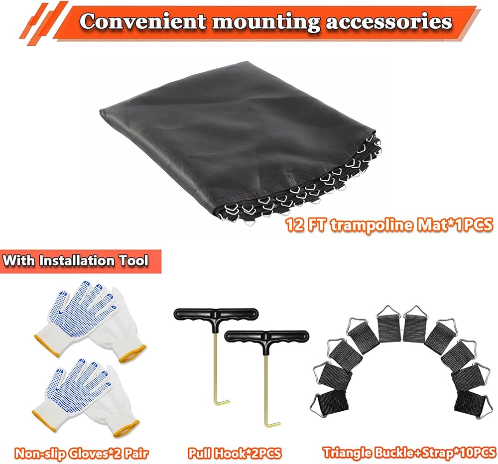 【Package Includes】 -In order to facilitate installation, we provide you a draw hook and 10 set triangle buckle+straps and one pair of gloves as a present to replace the trampoline jumping cloth.