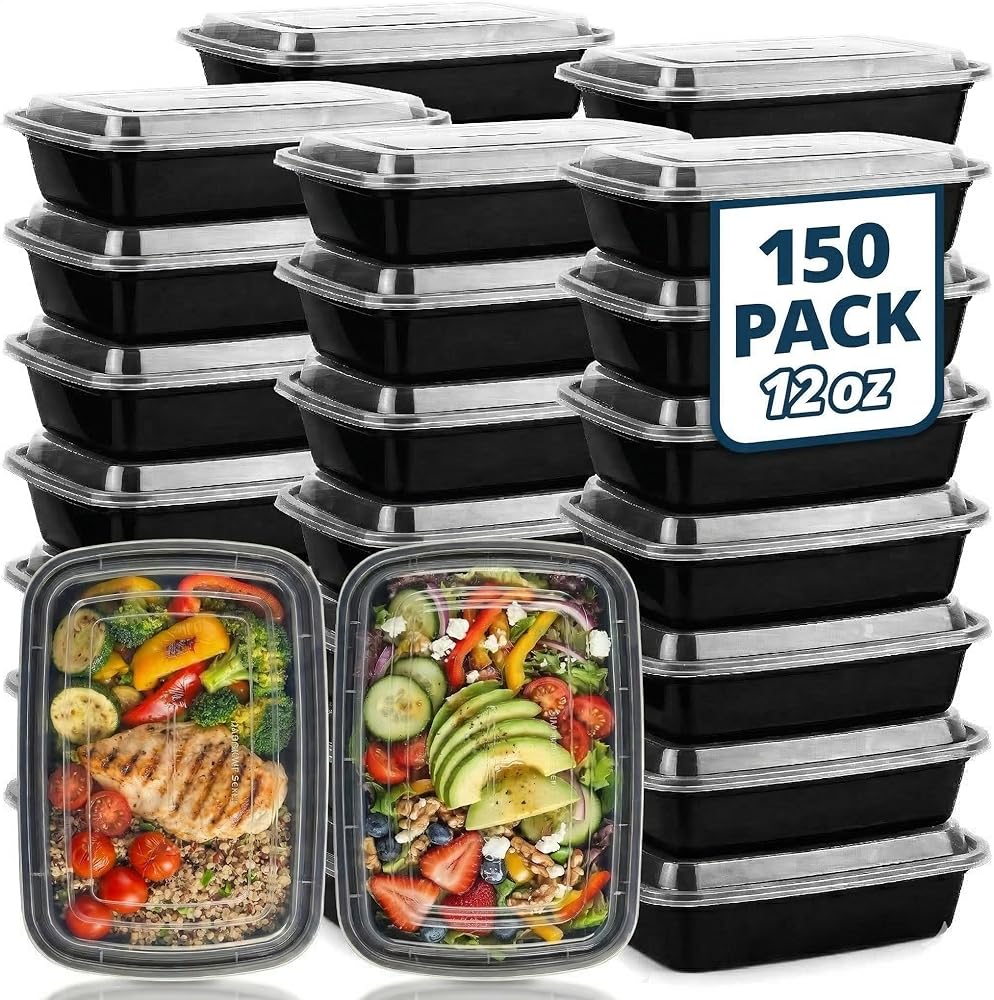 حاويات طعام TIYA Takeout - 12 أونصة كبيرة 150 عبوة مع أغطية - تخزين طعام بلاستيكي مستطيل - مجموعة مطاعم آمنة للاستخدام في الميكروويف وغسالة الأطباق - مقاومة للتسرب من أجل إعداد الوجبات والوجبات