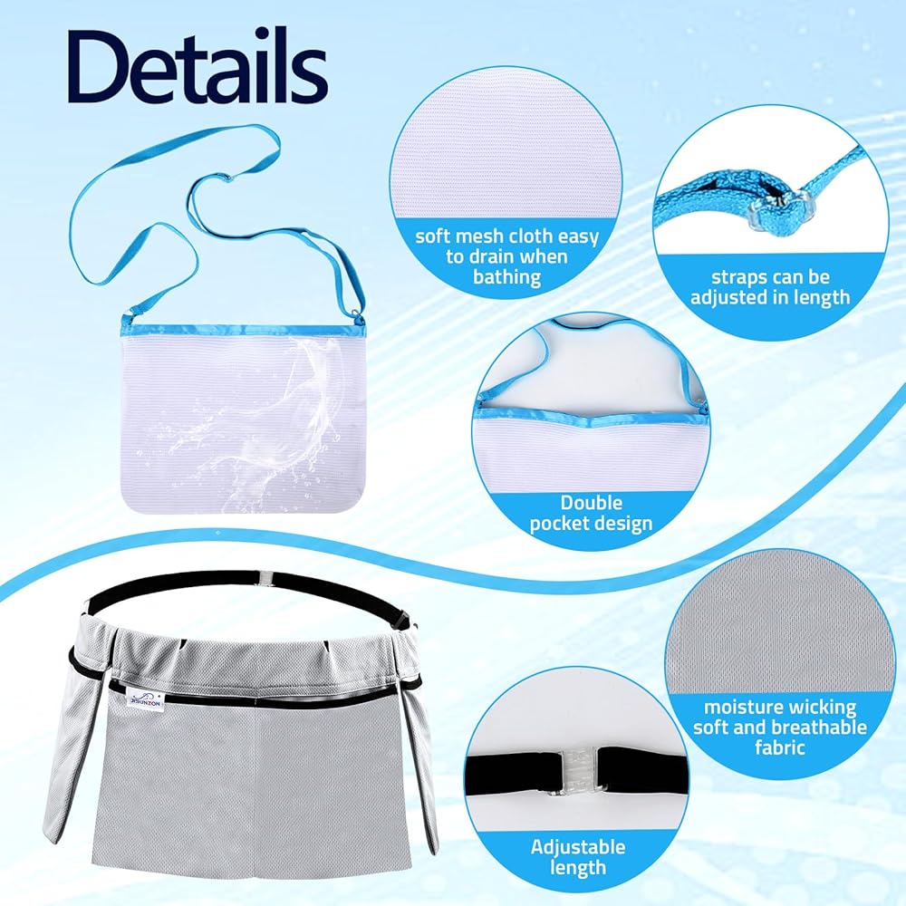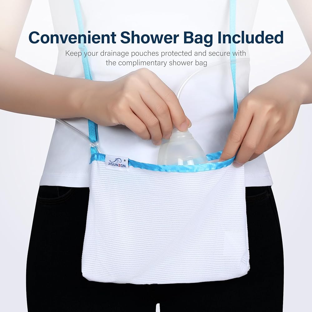Dual Drain Bottle Pockets: The shower pouch features dual drain bottle pockets, capably holding two bottles - one on each side. This promotes a faster healing process and decreases the chances of mess or discomfort