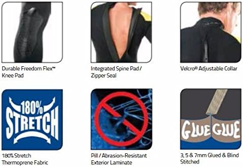 All seams are GBS-glued and blindstitched, which further prevents water seepage and extends suit life. Creature comforts include Lycra trimmed cuffs, a spinepad and an adjustable collar. To help protect the suit durable, yet flexible freedom flex knee pads are included.