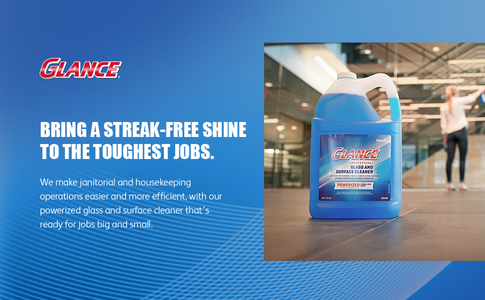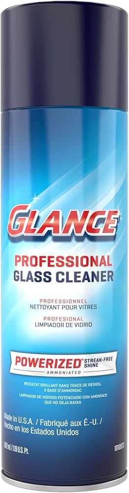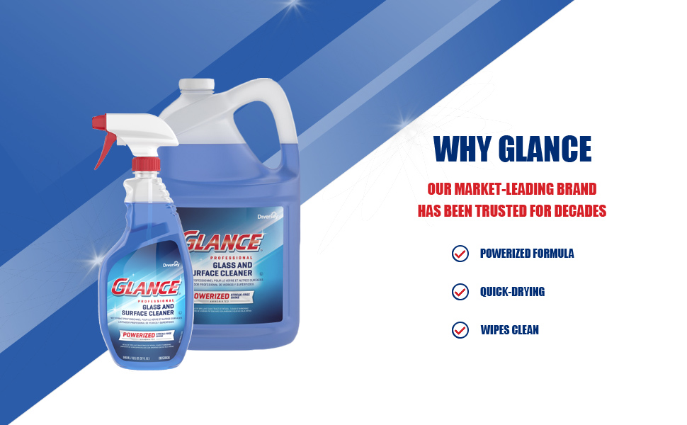 Glance is the market leading brand in the Janitorial and housekeeping market. Trusted for decades and admired for it's quick drying and Streak free shine. Our Chemists Powerized the formula with ammonia and additives to outperform other glass cleaners on the market. Leaves a brilliant shine on glass, mirrors, sinks, countertops, stainless steel and many other washable surfaces. Glance Powerized is ready-to-use on glass and other surfaces. Ocean Blue in color with a fresh ammonia scent.