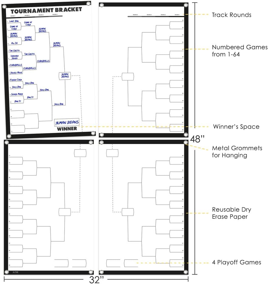 [كبير] قم بإنشاء دعامة كبيرة من March Madness بقياس 81.28 سم × 111.48 سم عن طريق تعليق جميع الملصقات الأربعة مع الحلقات المعدنية. مقاس الملصقات الفردية القابلة للمسح الجاف 40.64 سم × 60.96 سم.