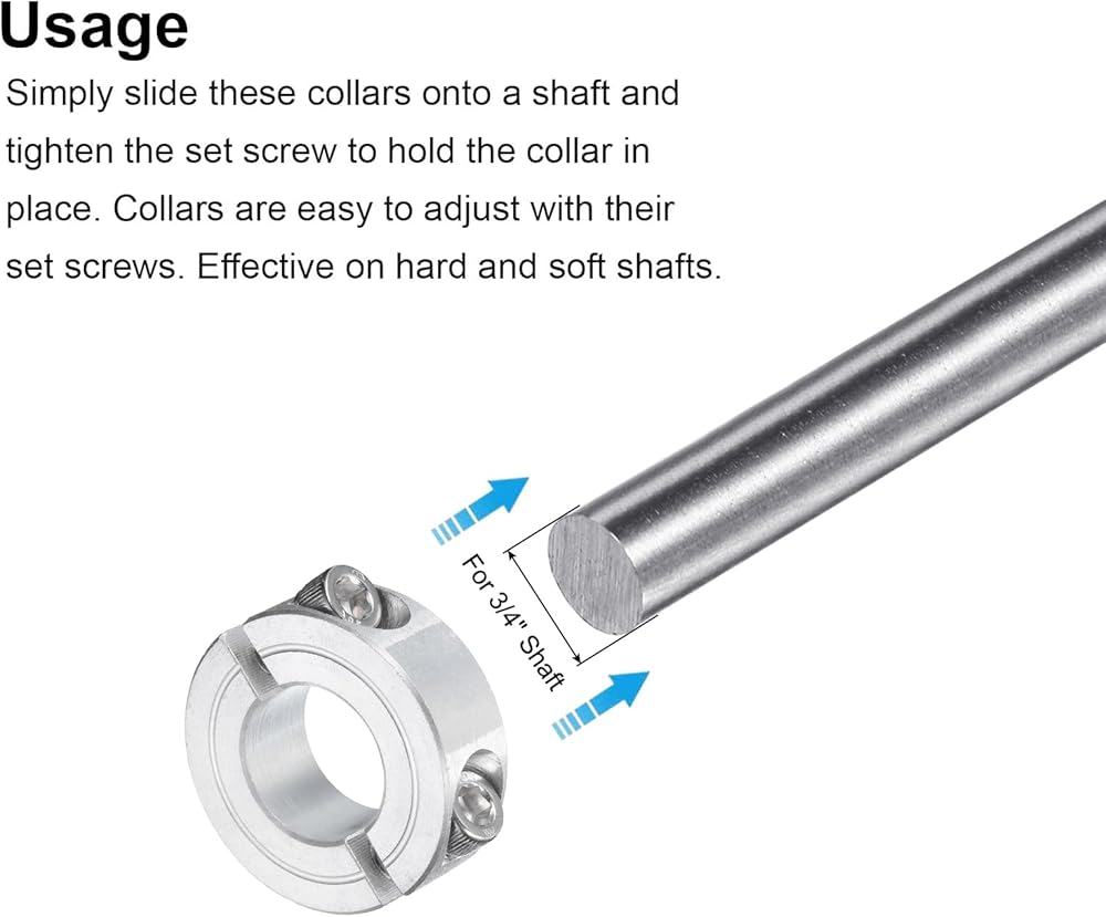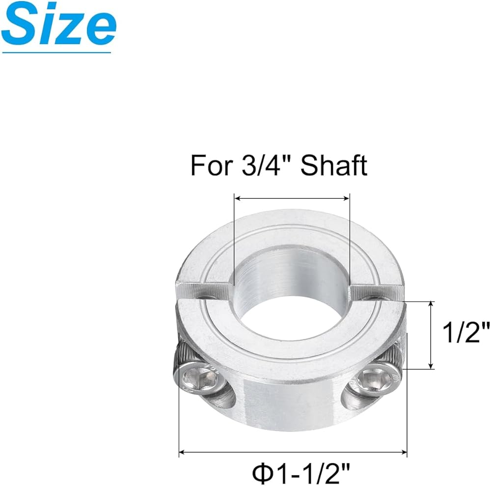 • Size - 3/4 inch split shaft locking collars, 1-1/2 inch outside diameter, 1/2 inch thickness.