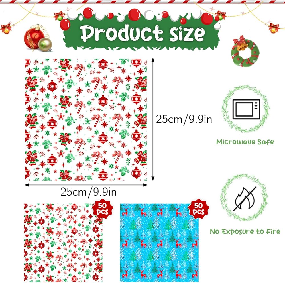 حزمة قيمة: سوف تحصل على 100 ورقة من ورق الشمع لعيد الميلاد بتصميمين مختلفين، 50 ورقة لكل تصميم، كمية وفيرة يمكن أن تلبي احتياجات الاستخدام المنزلي والاستبدال.