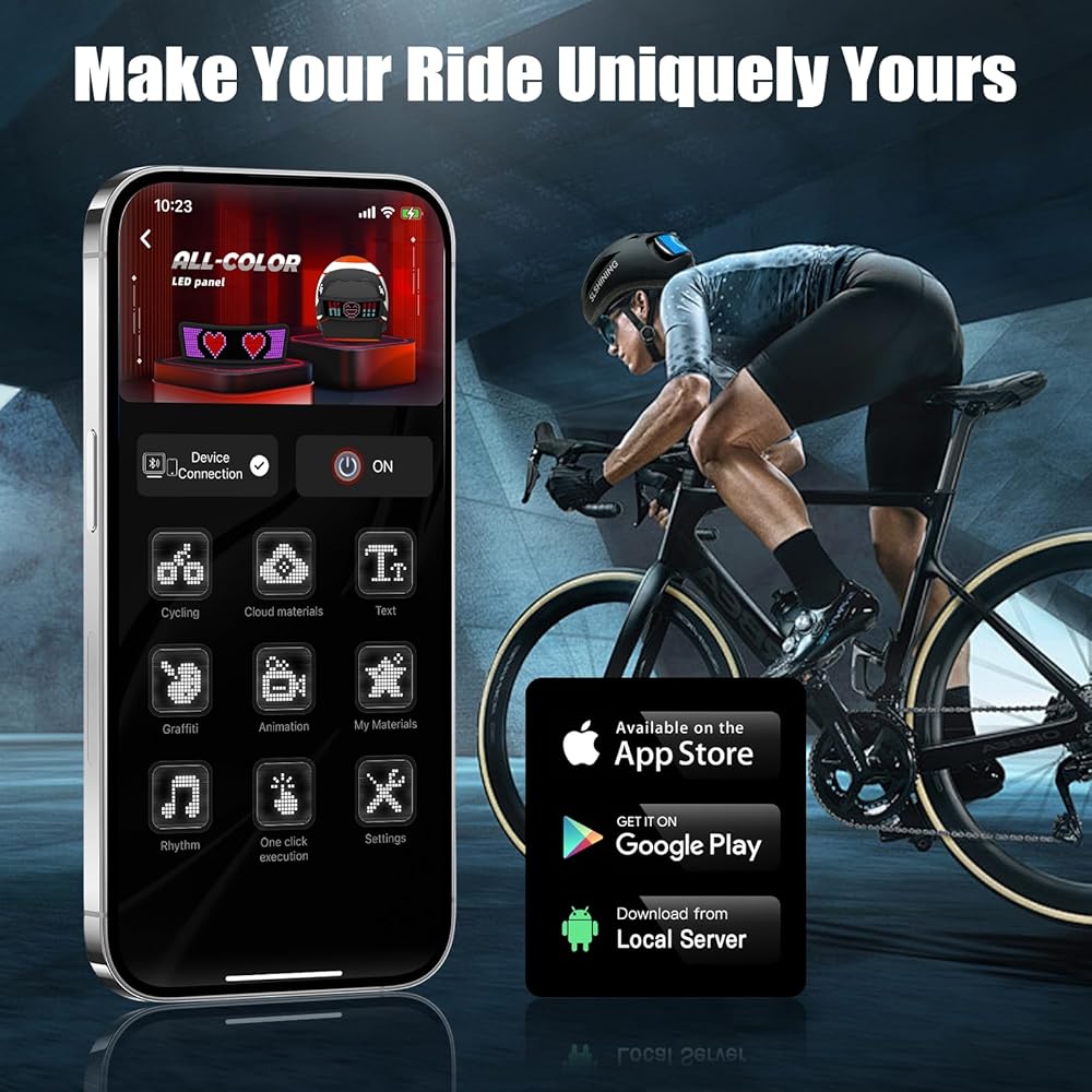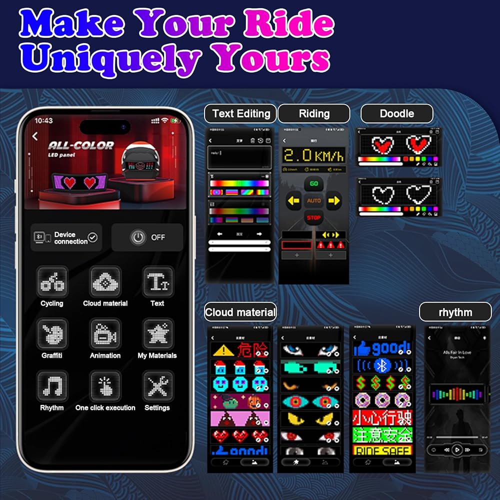 تجربة ركوب قابلة للتخصيص: من خلال تطبيق "Shining Display"، قم بتخصيص شاشة خوذة الدراجة الكهربائية الخاصة بك بمجموعة متنوعة من الأنماط والرسائل النابضة بالحياة. لا يعكس هذا التخصيص شخصيتك فحسب، بل يعمل أيضًا على تحسين رؤيتك، مما يجعلك متميزًا على الطريق