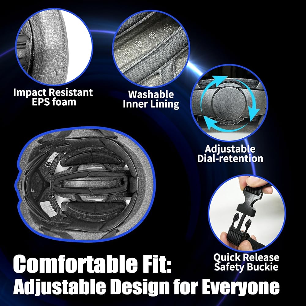 ملاءمة قابلة للتعديل وسهلة التركيب: تم تصميم خوذة الدراجة للبالغين لتناسب أحجام الرأس المختلفة بشكل مريح، مما يضمن ملاءمة آمنة ومريحة لكل من الرجال والنساء. تركيبها السهل يجعلها متوافقة مع مجموعة واسعة من خوذات الدراجات والدراجات النارية، مما يضيف الراحة لجميع راكبي الدراجات