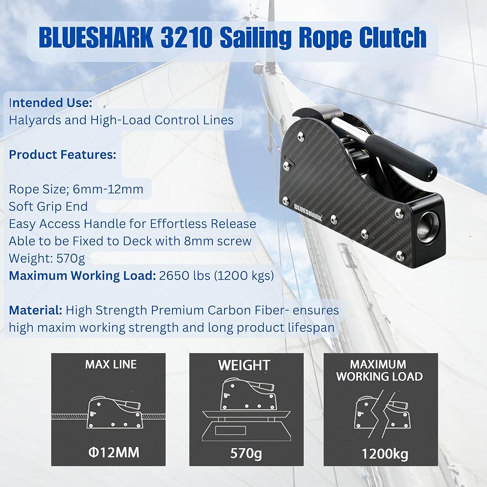 BLUESHARK 3210 Sailing Rope Clutch-Carbon Fiber Material Max Working Load 2650 Lbs Max Line 12mm for Halyards and High-Load Control Lines