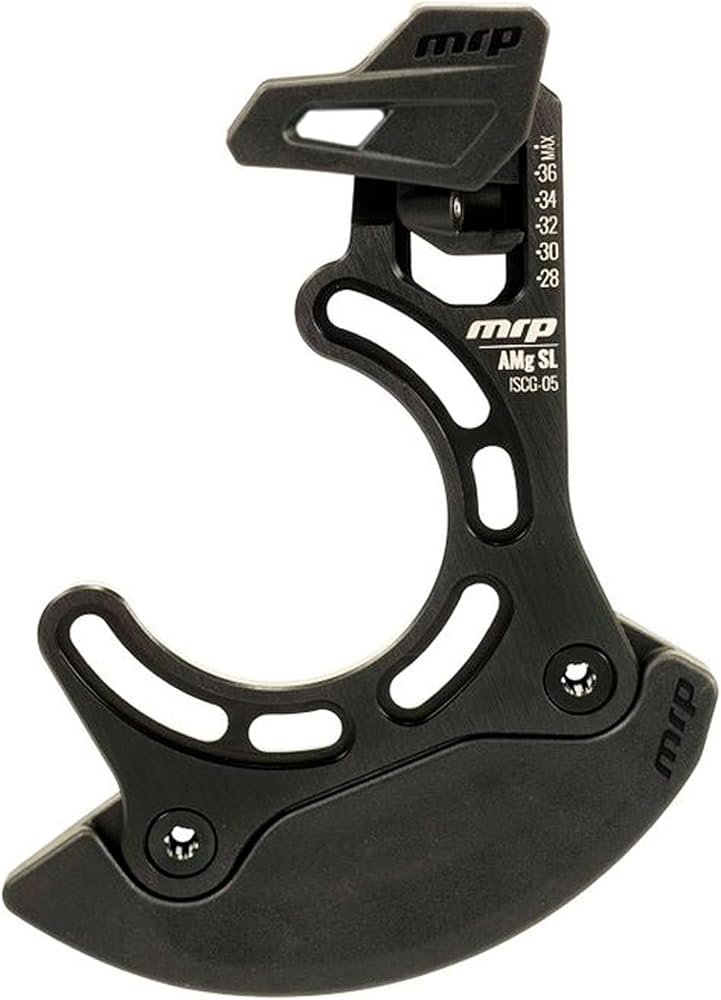 The MRP AMg SL chainguide eliminates dropped chains and bent chainrings. It combines a lightweight upper guide and a durable bashguard, mated to an aluminum backplate. Unlike the cheap, flexy, and rattle-prone upper guides found on other products, the AMg features our premium, stiff, silent upper guide and a tough fiber-infused bashguard.Features-Aluminum back plate is strong and lightweight-Works with 32-36t round rings (and 30-34t oval rings)-4mm of chainline adjustment (without use of spacers) so adjustments can be made quickly-Works with most chainlines (including non-boost, Boost, and Super Boost)-Forefront 4-way, front-accessible setup and adjustment-Pop-Up tool-free chain access for simplified installation and drivetrain maintenance-Upper guide features TPU co-molding to silence chain contact-Requires ISCG-05 tabsItem Specifications-Chainguide Mount Type:ISCG-05-Material:Aluminum-Material:Composite-Max Tooth (teeth):36-Color:Black-Weight:105-Bashguard:No-Defined Color:Black