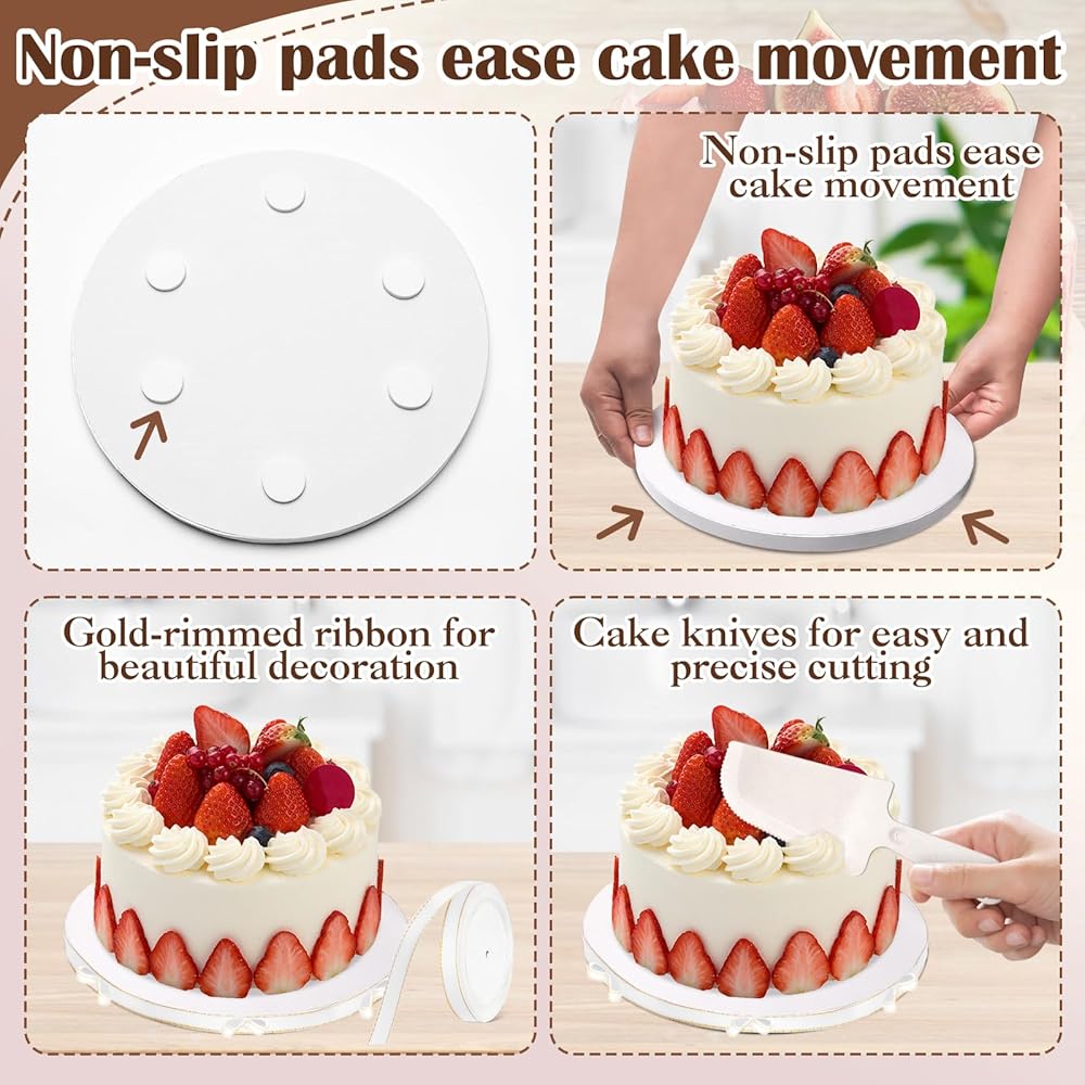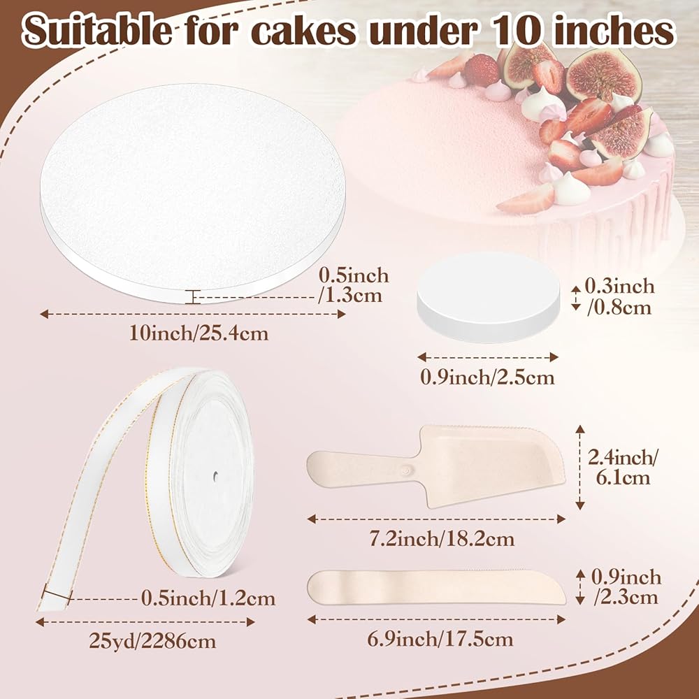 𝐏𝐞𝐫𝐟𝐞𝐜𝐭 𝐏𝐫𝐞𝐬𝐞𝐧𝐭𝐚𝐭𝐢𝐨𝐧 𝐒𝐞𝐭: تتضمن 12 قطعة من براميل الكيك مقاس 10 بوصات، كبيرة بما يكفي لحمل الكعك أقل من 10 بوصات، مع 20 قطعة -وسادات قابلة للانزلاق لعرض مستقر وسهولة الحركة لتلبية التغييرات اليومية. تحتوي على سكاكين للكيك ولفة بطول 25 ياردة من الشريط ذو الحواف الذهبية لسهولة الاستخدام وتزيين الكعك وألواح الكيك في أي وقت، مما يجعل لوح الكيك الخاص بك يبدو أكثر أناقة. هذا التطابق المثالي ضروري لأي كعكة مناسبة خاصة.