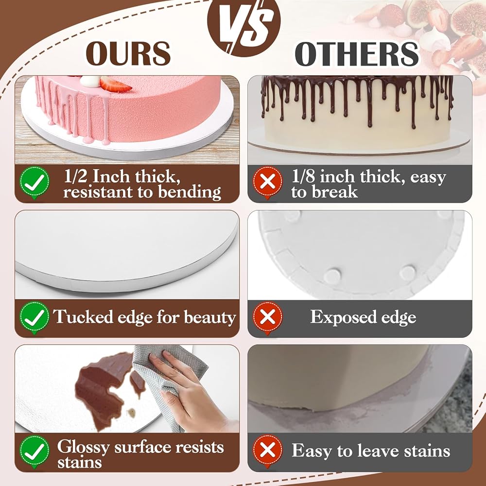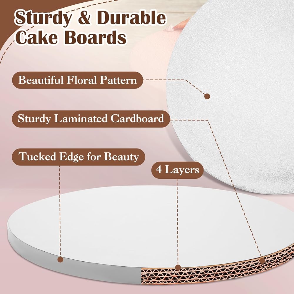 طبلة الكيك هذه بسمك 1/2 بوصة، مصنوعة من 4 طبقات من الورق المقوى المموج القوي والمتين، توفر قاعدة الكيك دعمًا ثابتًا وسطحًا مستوًا لمنع الانحناء جي وتزييفها. مصممة للكعك الثقيل، وهي مثالية للنقل ومنع التشققات. تتميز لوحة الكيك بتصميم حافة كاملة لمظهر أكثر جمالاً، والنمط المشرق في الأعلى مصمم بشكل جميل لعرض مثالي للكعك. يمكن للجزء السفلي غير اللامع أن يمنع الانزلاق بشكل فعال.