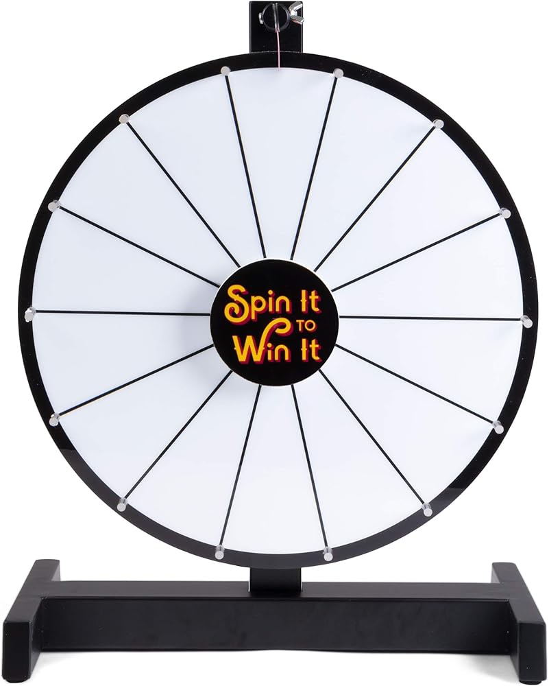 The high quality acrylic surface makes standard dry erase marker use and clean-up a breeze. Write specific rewards, game rules, and more on each blank slot. Travel friendly compact size makes transportation to your vendor stand, party, or office easy. At 15" in diameter, this compact prize wheel is the perfect option for your home, office desk, or kiosk! Fits perfectly on tabletops at your trade show event!