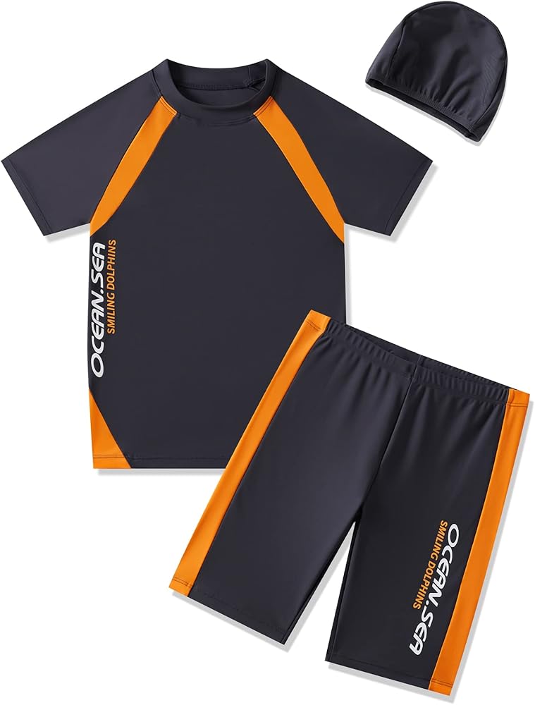 مادة متينة وإيلاستين: طقم السباحة للأولاد مصنوع من 80% نايلون و20% سباندكس. بدلة السباحة للأولاد المكونة من قطعتين مقاومة للملح، وقابلة للتمدد، وسريعة الجفاف، ومريحة وصديقة للبشرة، مما يجعل طفلك يشعر بالاسترخاء والراحة.