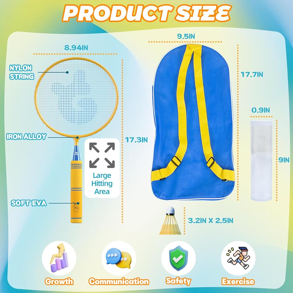 • متين وخفيف الوزن وحجم مناسب للأطفال: تم تصميم مجموعة مضارب كرة الريشة الخاصة بنا خصيصًا للأطفال من سن 3 إلى 12 عامًا. يتميز بإطار مقوى ومقبض ناعم من NBR، مما يضمن متانة طويلة الأمد. توفر القبضة الناعمة المزيد من الراحة والتحكم أثناء اللعب، مما يتيح للأطفال الاستمتاع بالرياضة بشكل كامل دون أي مشاكل. بأبعاد 17.3*8.7 بوصة ووزن 0.5 كجم فقط، من السهل على الأطفال حملها واللعب بها