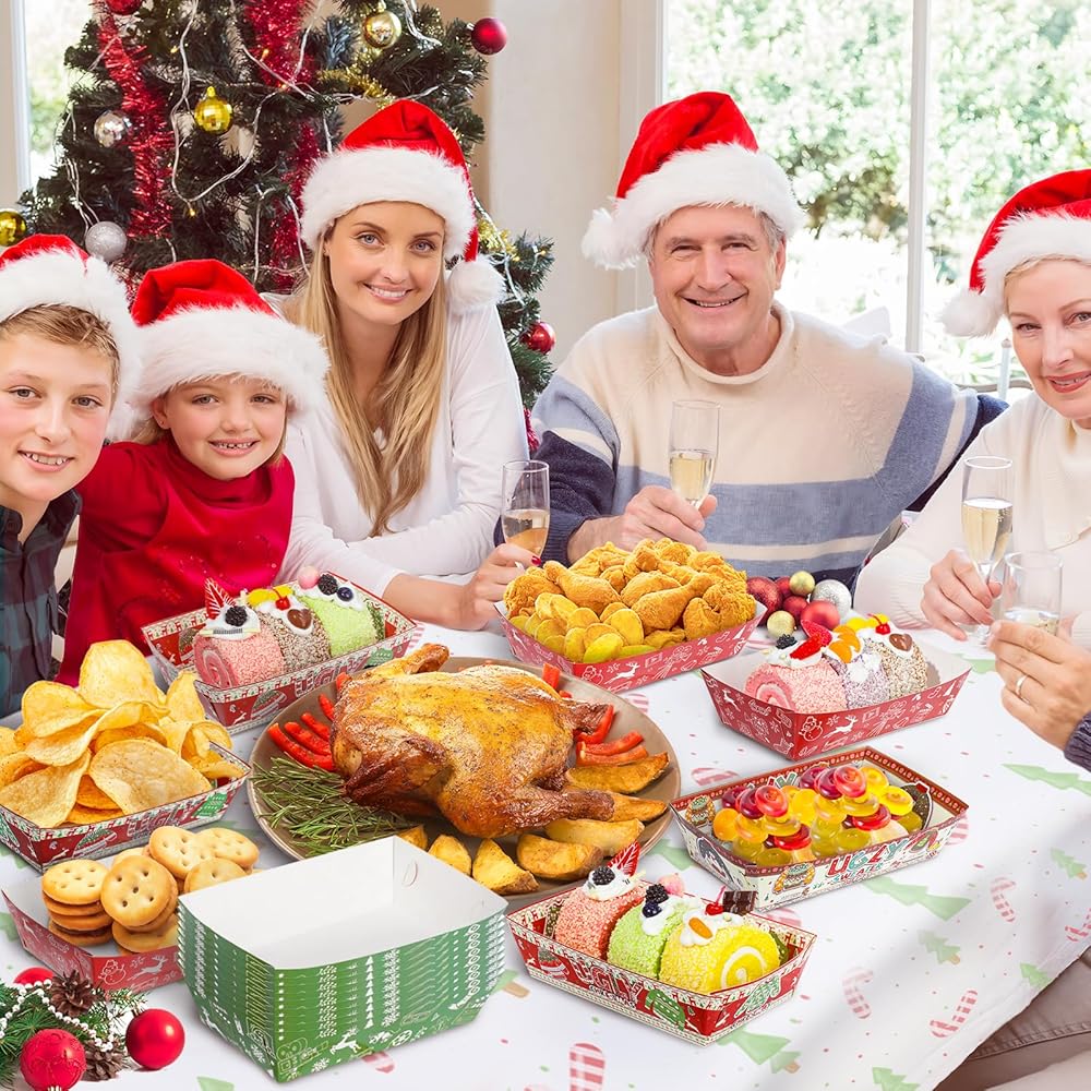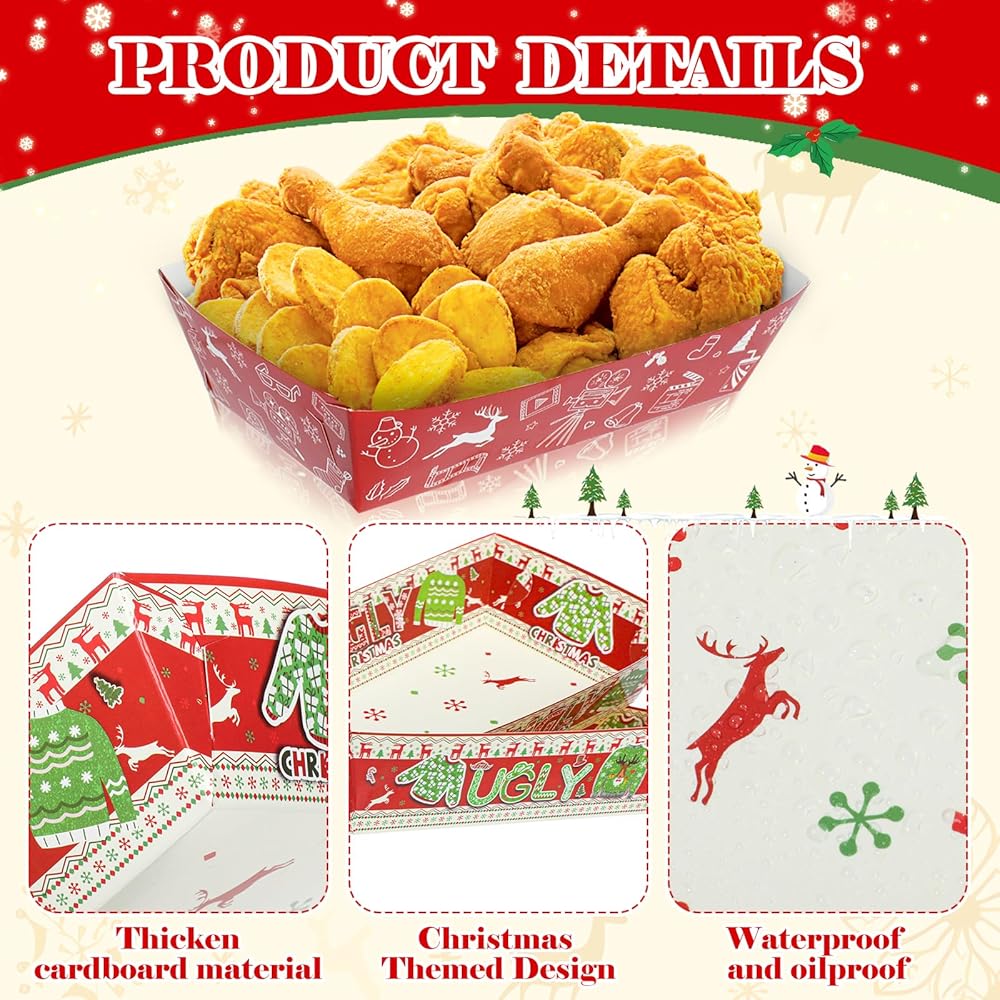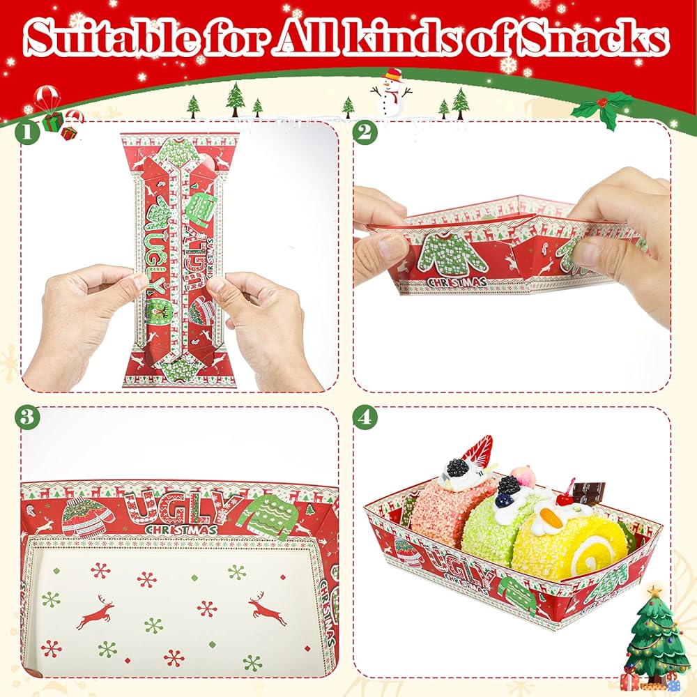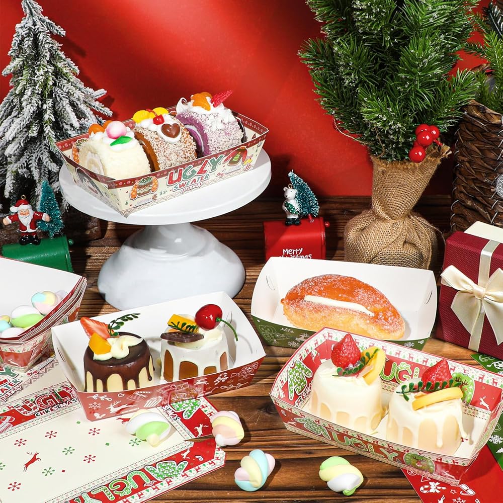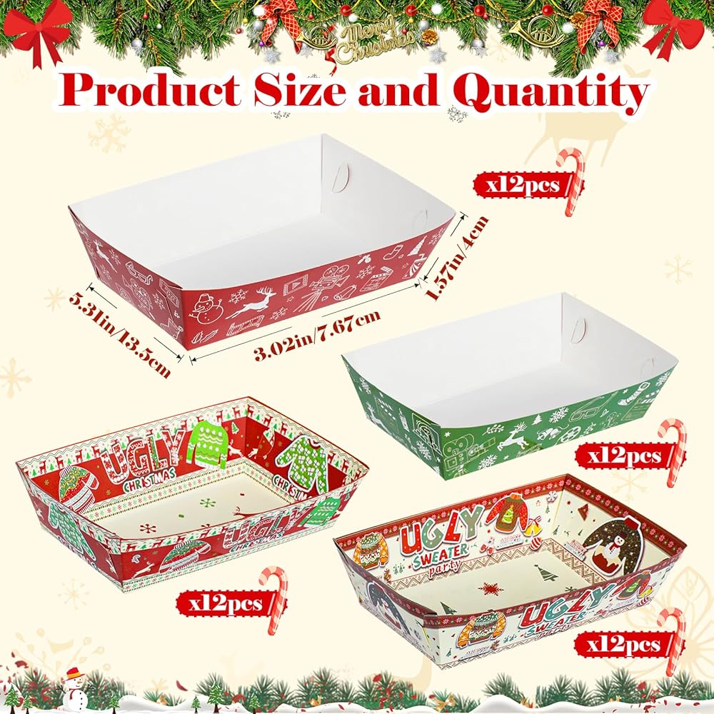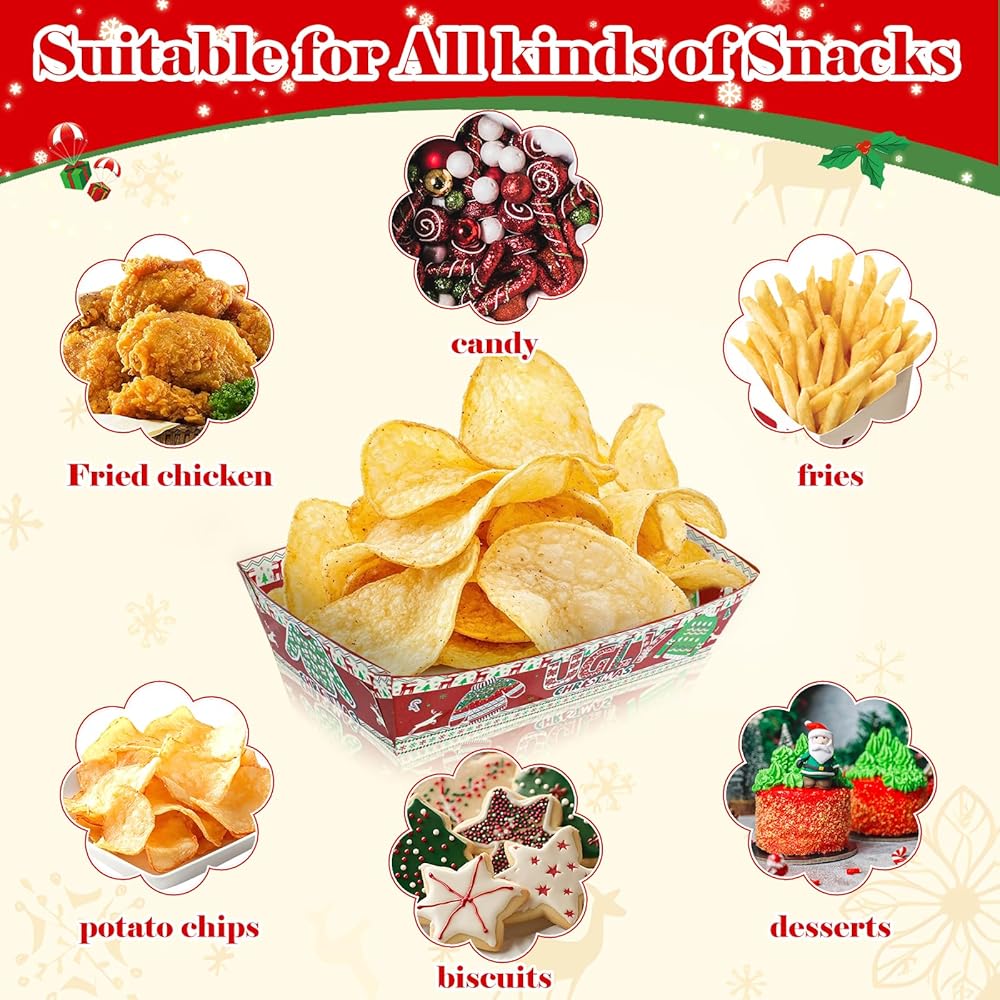 48 قطعة من صواني الطعام الورقية لعيد الميلاد، لوازم حفلات الكريسماس، صواني تقديم الوجبات الخفيفة للاستعمال مرة واحدة، قوارب الطعام لعيد الميلاد ووعاء الفشار للوجبات الخفيفة لتزيين عطلة الشتاء وعيد الميلاد