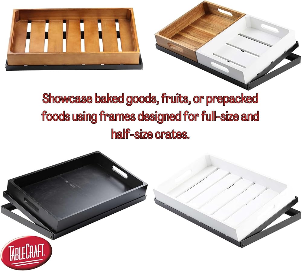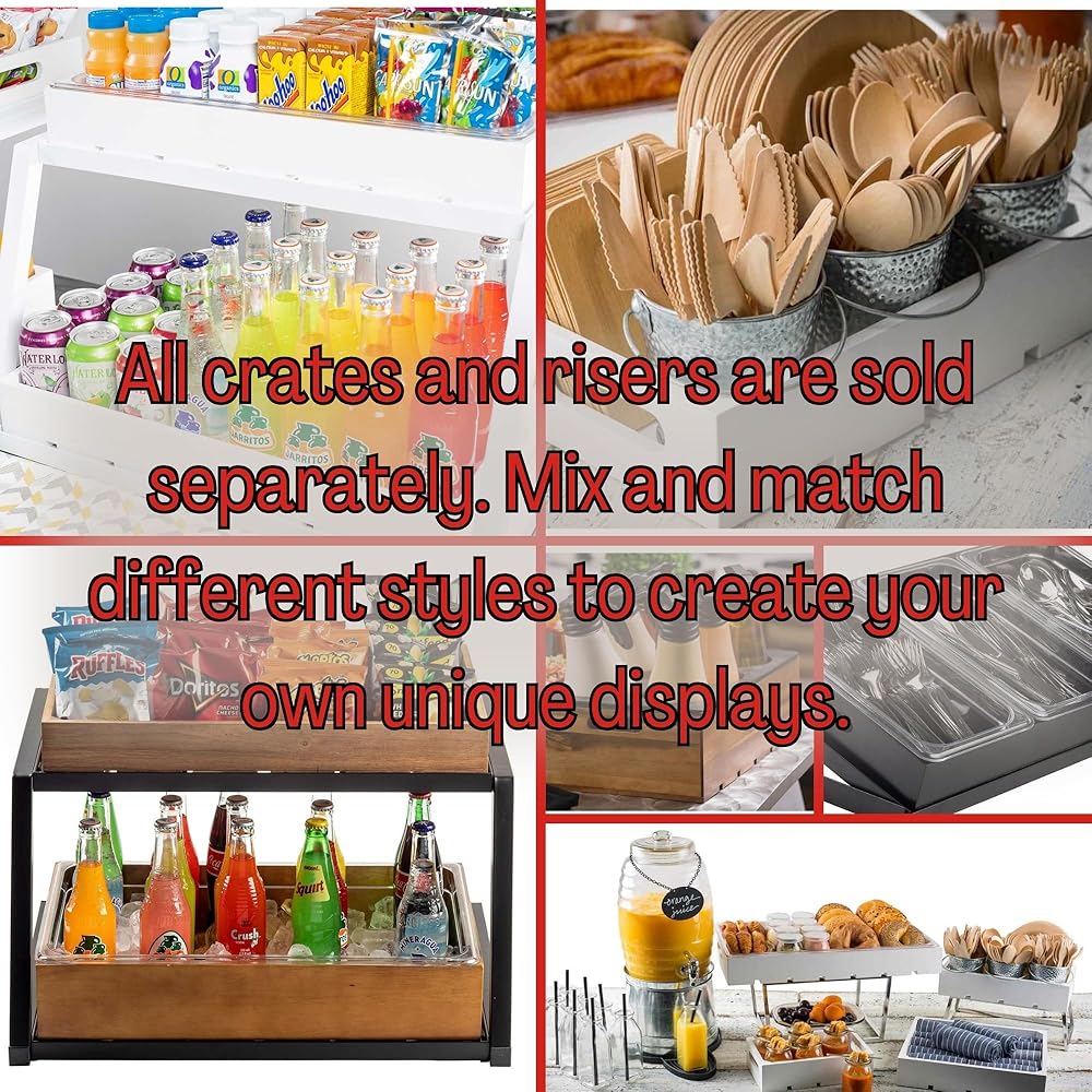 • Since and Two-Tiered Crate Frame Risers: This tiered storage and display shallow baskets are perfect for maximizing space and enhancing visibility of your products. Choose fromwood food stand or a white wood crate for table display.
