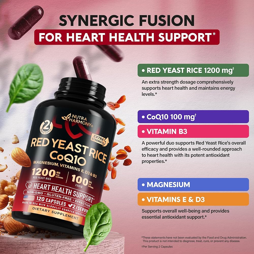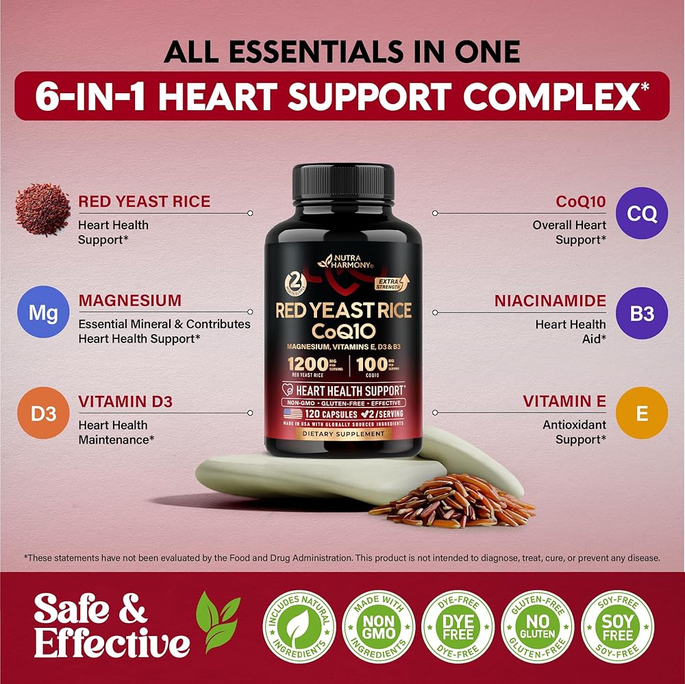 • أرز الخميرة الحمراء 1200 مجم - مدعم بـ CoQ10 100 مجم. تركيبة القلب تجمع بين 1200 ملغ من أرز الخميرة الحمراء القوي و100 ملغ من CoQ10 لكل وجبة لدعم صحة القلب. تم تصميم هذه الكبسولات لمزيد من القوة، وهي تساعد في أداء وظائف القلب وتساهم في صحة القلب بشكل عام. يدعم CoQ10 المضاف إنتاج الطاقة، مما يزيد من دعم حيوية القلب.