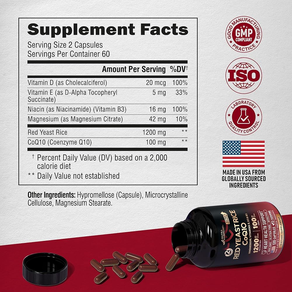 أرز الخميرة الحمراء 1200 مجم مع CoQ10 100 مجم - مع المغنيسيوم | النياسين | فيتامين E وD3 - دعم صحة القلب والطاقة والتمثيل الغذائي - فعال وخالي من التدفق وتم اختباره معمليًا - صنع في الولايات المتحدة الأمريكية، 120 كبسولة