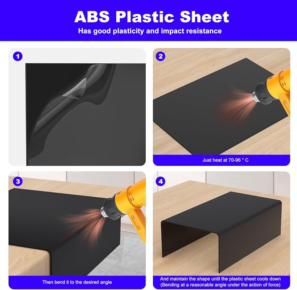 【استخدام بسيط】يمكن قطع الطبقة البلاستيكية ABS السوداء بسهولة بواسطة منشار الطاولة ومنشار السلك وبخاخ الماء في درجة حرارة الغرفة، ويمكن ثنيها بسهولة وتشكيلها تحت تسخين مسدس الهواء الساخن والماء المغلي. من السهل الحفر والقطع. (احمي يديك عند الاستخدام)