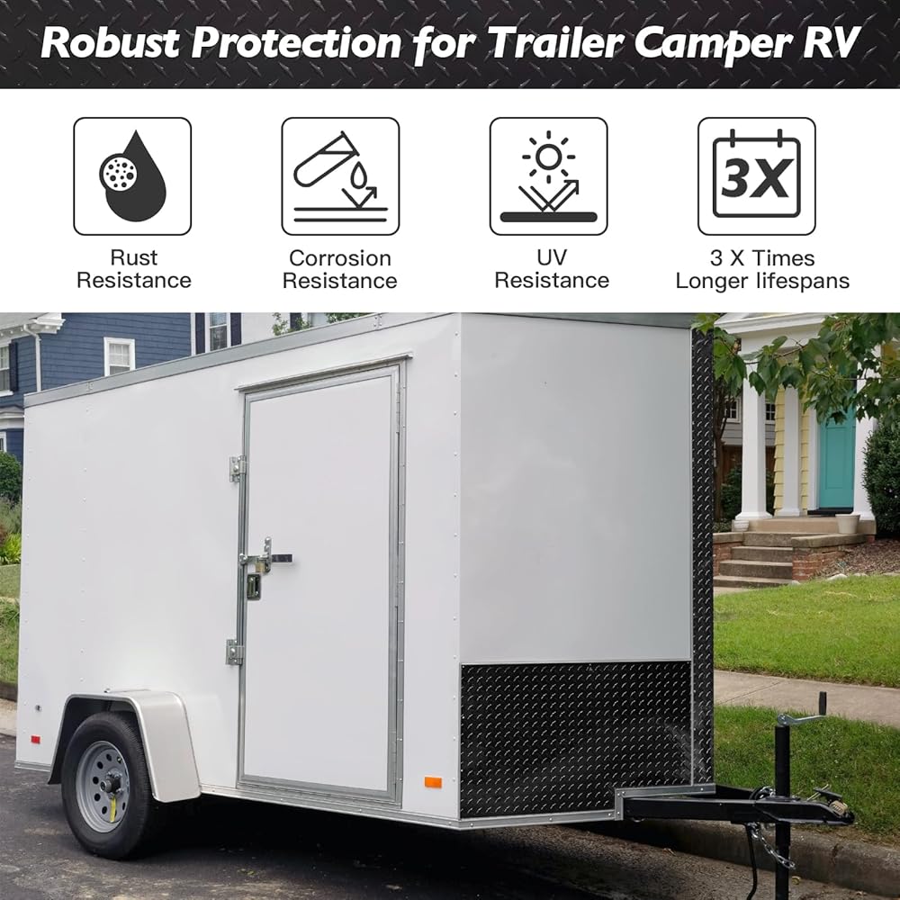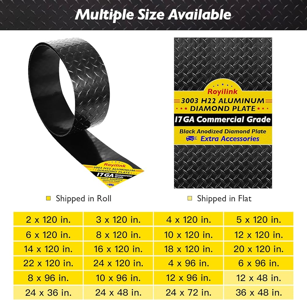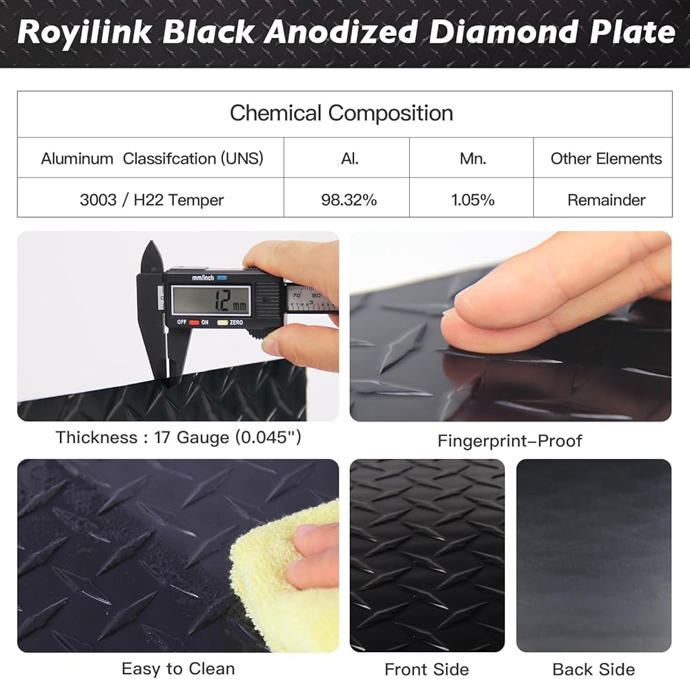 جمالية ومتينة: توفر ورقة اللوحة الماسية السوداء المؤكسدة مظهرًا أنيقًا ومقاومة ممتازة للطقس، ومناسبة للديكور المتميز والاستخدام الخارجي، مثل واقي حجر المقطورة، وانحياز المركبات الترفيهية، والتخييم، وزخرفة زاوية عربة الجولف، إلخ. ارفع تصميمك بأناقة والمرونة!