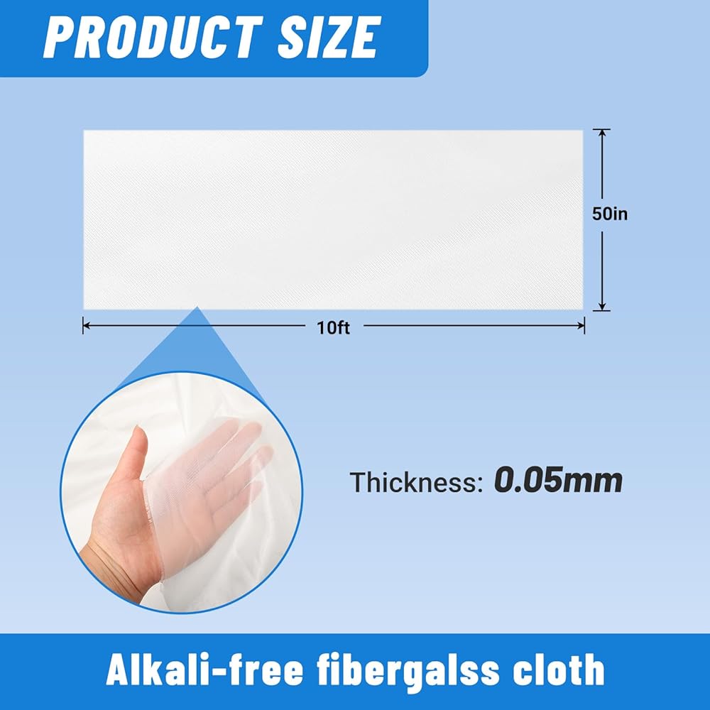 جودة عالية: يبلغ قياس قماش الألياف الزجاجية 50 بوصة × 10 أقدام / 127 × 300 سم، نسيج عادي غير قلوي بسمك 0.05 مم، مرن وناعم، منسوج بالالتواء واللحمة، نسيج مستطيل، بدون عيوب، بدون عوائق.