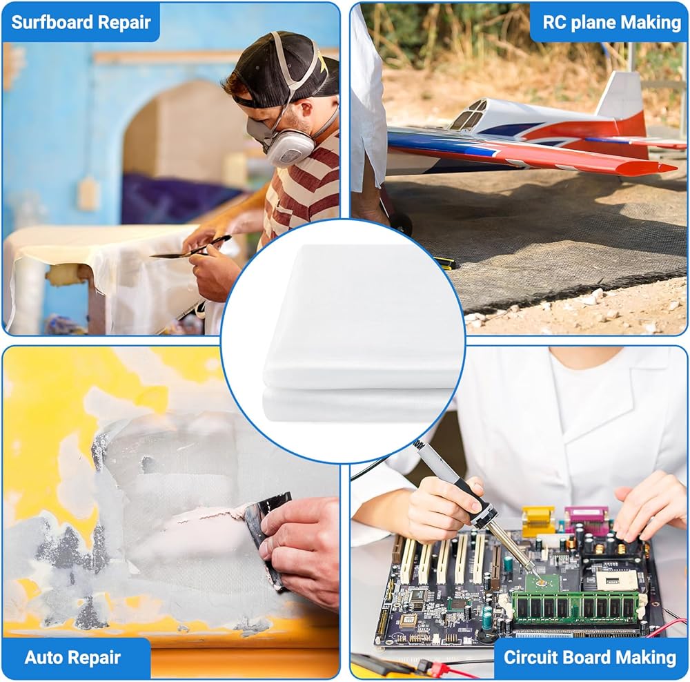 يستخدم على نطاق واسع: هذا القماش المصنوع من الألياف الزجاجية خفيف الوزن وقوي، مما يجعله مثاليًا لإصلاح العديد من الأسطح، بما في ذلك المعدن والبلاستيك والسيراميك والخشب والخرسانة والمزيد. كما أنها مثالية لإصلاح وصنع لوحات الدوائر للقوارب وطائرات RC وألواح ركوب الأمواج في السيارات وأحواض الاستحمام وحمامات السباحة وما إلى ذلك.