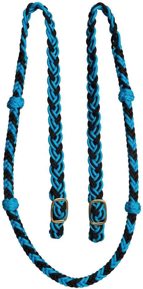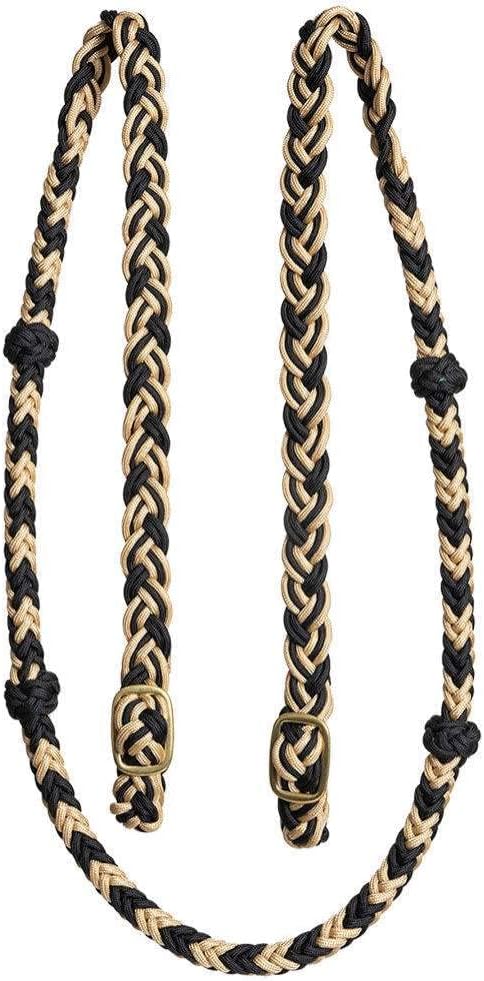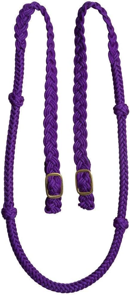 Mustang Cable Knotted Nylon Rein w/Solid Brass Conway Buckles 3/4 x 7 Round braided nylon rein with four easy grip knots and solid brass conway buckles on each end. Rein features heavy gauge steel wire core inside handle. The steel wire reduces the amount of slack in the rein and helps to aid in lighter hands. There is no stretch or extra slack to get in the way.