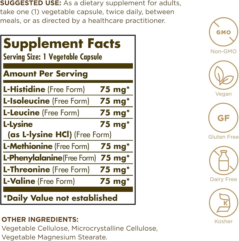 • غير معدّل وراثيًا وخالي من الغلوتين؛ Solgar Essential Amino Complex هو مركب غير معدّل وراثيًا، نباتي، وكوشير، وخالي من: الغلوتين، والقمح، والخميرة، والسكر، والملح، والنكهات الاصطناعية، والمحليات الاصطناعية، والمواد الحافظة الاصطناعية، والألوان الاصطناعية.