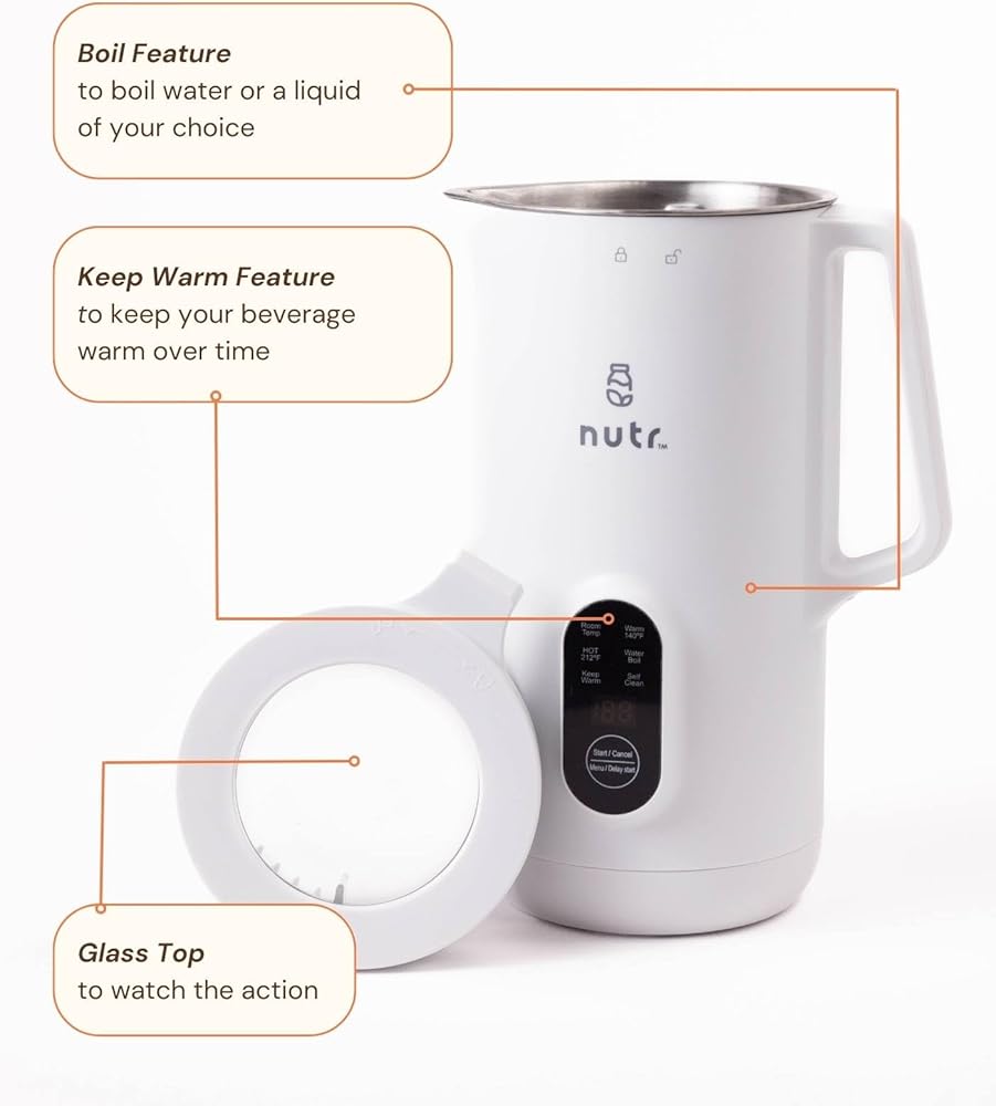 صانع حليب الجوز: قم بإعداد الحليب النباتي محلي الصنع في دقائق. يوفر Nutr تجربة صنع مشروبات خالية من الألبان وخالية من الفوضى. تقوم آلتنا بمزج المكسرات والحبوب للحصول على حليب ناعم وغني وكريمي. بالإضافة إلى ذلك، قم بإعداد مجموعة متنوعة من المشروبات النباتية الساخنة والباردة، بما في ذلك الكريمات واللاتيه والعصائر والمخفوقات والمزيد! تحقق من وصفات Nutr الحقيقية والمجربة، أو كن مبدعًا في مطبخك