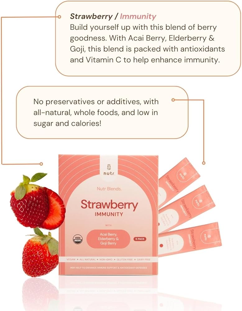 نكهة الفراولة: نكهة الفراولة لدينا تأتي مع وظيفة المناعة وطعم التوت الغني. مع مجموعة متنوعة من التوت المختلفة، هذا المزيج مليء بمضادات الأكسدة وفيتامين C للمساعدة في تعزيز المناعة.