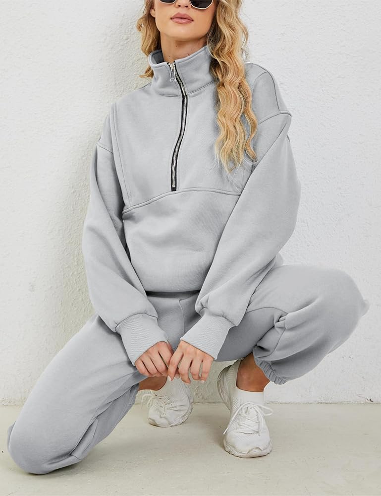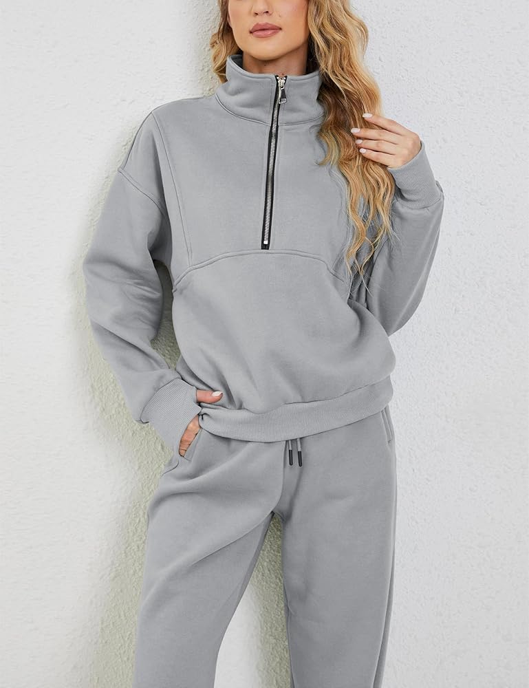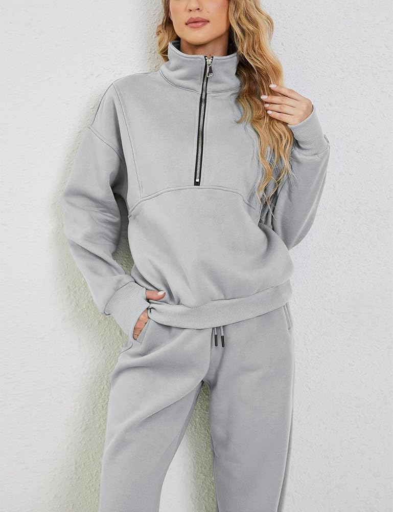 المزايا: طقم سويت شيرت وبنطال رياضي للنساء، نصف سحاب، وأكمام طويلة، لون خالص، أساور مضلعة، بنطال رياضي طويل، ياقة مرنة عالية الخصر، وجيبين، يجمع بين الموضة والعملية للحصول على مظهر أنيق ومريح