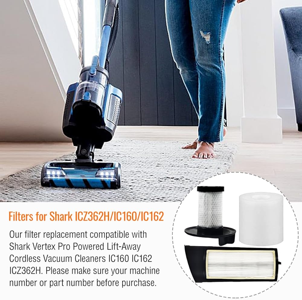 This vertex cordless vacuum filter replacement kit is compatible with Shark Vertex Pro Powered Lift Cordless Vacuum Cleaner IC160 IC162 ICZ362H, please confirm your vacuum filter model before purchasing.
