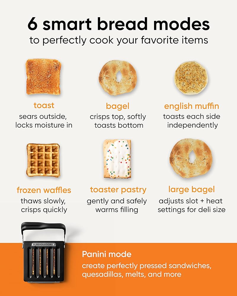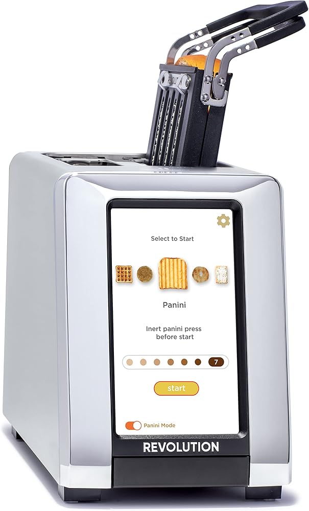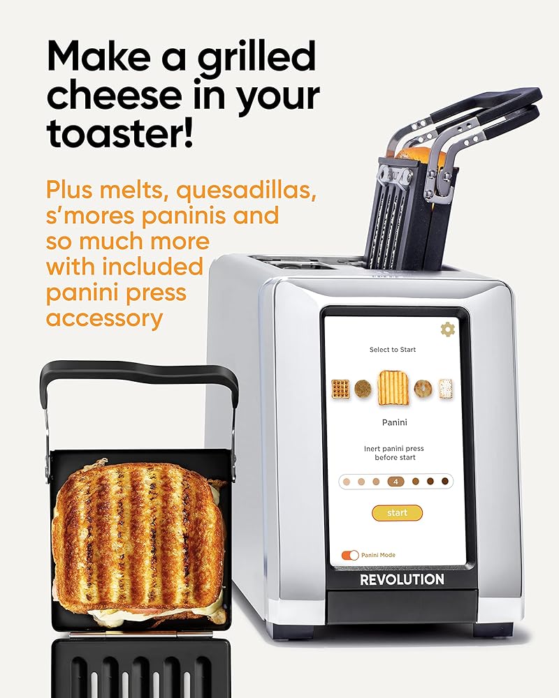 محمصة الخبز Revolution InstaGLO® R180S، مصنوعة من الفولاذ المقاوم للصدأ/الكروم + عصارة توست ريفولوشن (حزمة) - الخبز المحمص المثالي والجبن المشوي والكساديلا والبانيني في محمصة الخبز (عنصران)