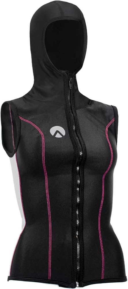 More than 25% of body heat is lost through the head and extremities of the body. The vest with hood design provides the best insulation and protection for colder dives. The hood protects against chaffing from mask straps, keeps your head and ears toasty warm. The fullzip design allows you to zip up for 100% warmth and protection, or zip completely down when the sun comes out, your work rate goes up or just for ease of getting on and off.