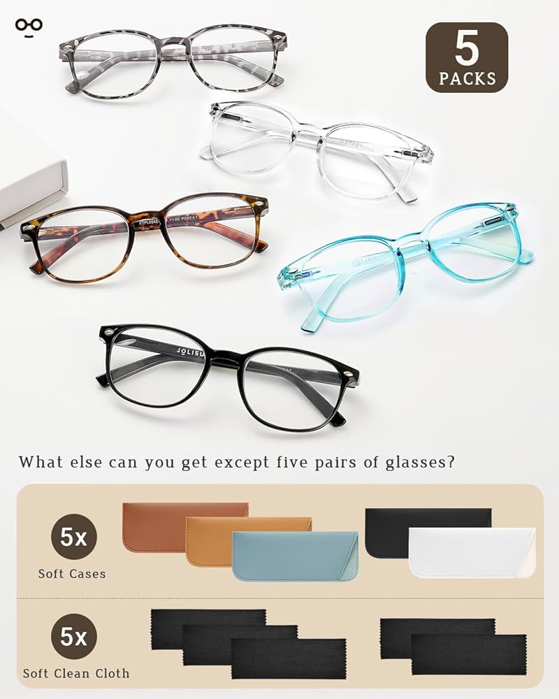 • مجموعة مريحة: 5 أزواج من نظارات قراءة الكمبيوتر + 5 عبوات من أكياس القراءة الناعمة + 5 قطع من قماش التنظيف المصنوع من الألياف الدقيقة. رائعة للاستخدام في المنزل أو المكتب أو بجانب السرير. احتفظ بزوج منها على مكتبك، وفي حقيبتك، وفي أماكن القراءة المفضلة لديك