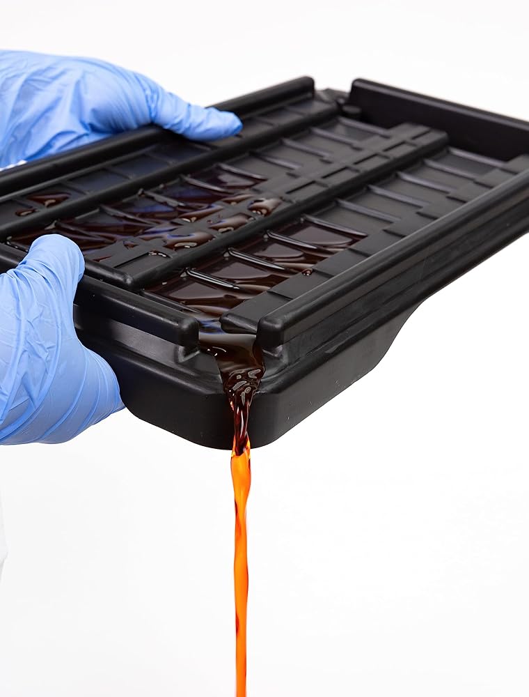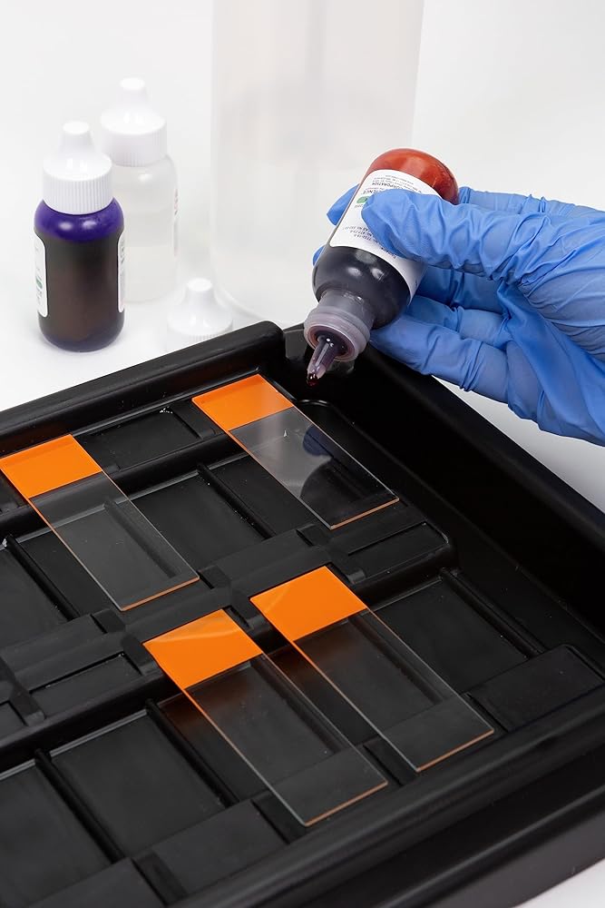 This Heathrow Scientific Slide Staining Tray holds up to 18 standard microscope slides (76 x 26 mm) securely in place for staining, rinsing, and drying applications. It is ideal for clinical and research laboratory staining. This slide tray is durably constructed from solvent-resistant polypropylene and features non-skid silicone feet to keep the tray in place. There are two ways to empty stain liquid from the tray, you can either pour spouts on each corner or use the drain hole. A drain hole is included with the plug. A black lid is also included for light sensitive applications. This slide tray is equipped with handle cut-outs for easy handling. It also features humidity retention wells for specialized staining needs. This slide staining tray is proudly made in the USA.