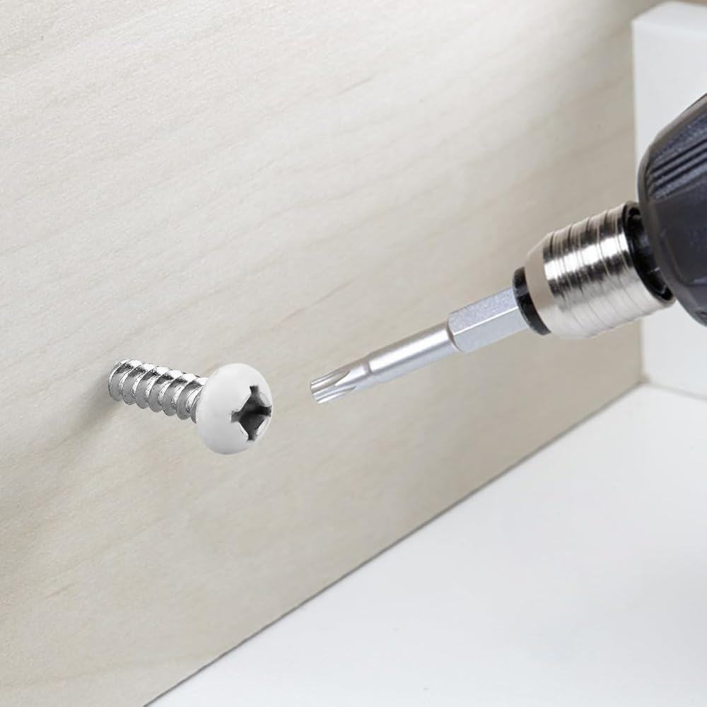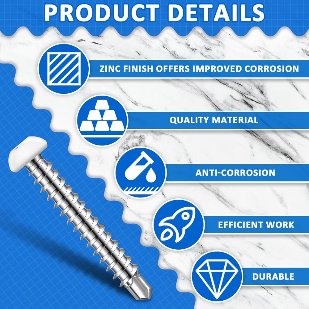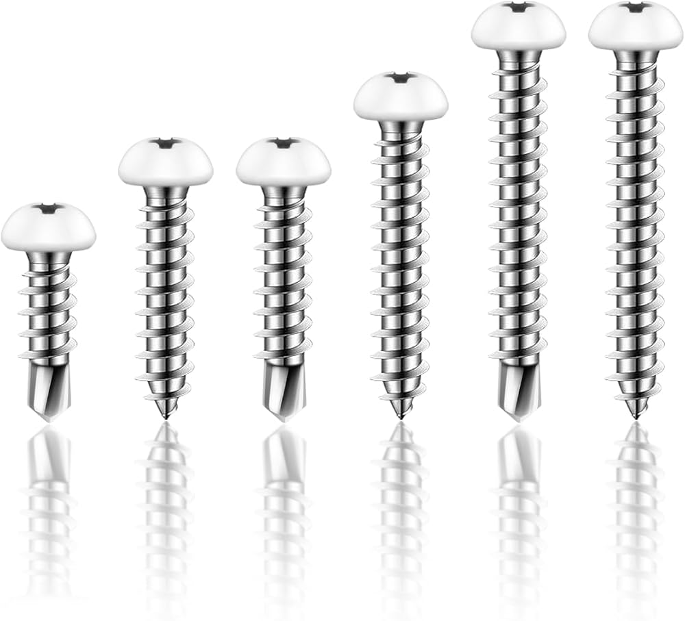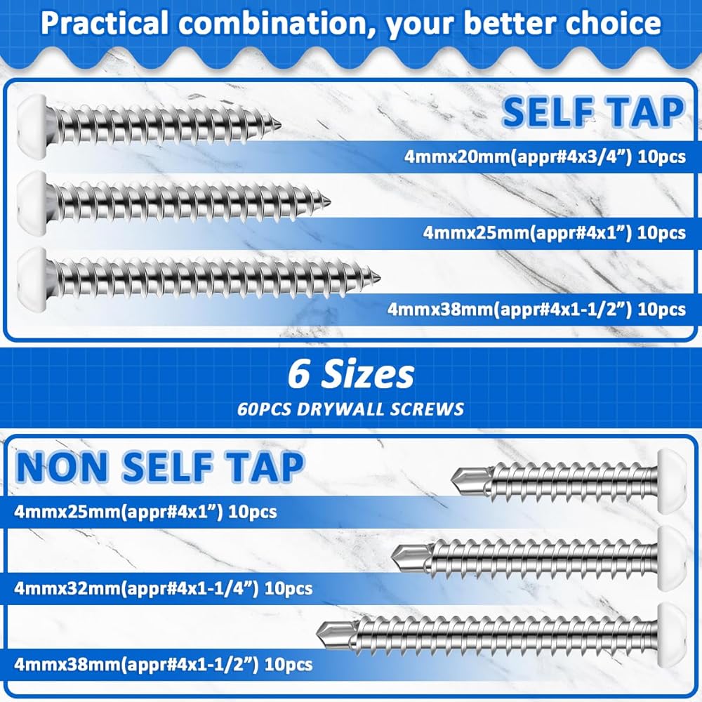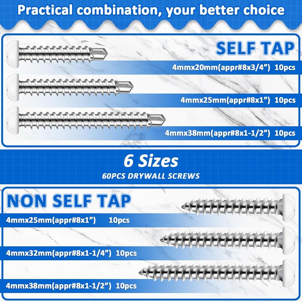 "Satisfy Your Daily Needs:The diameter of these white metal screws are #8, available in 6 sizes, including Self Tap 3/4 inch,1 inch,1-1/2 inch,Non Self Tap 1 inch, 1-1/4 inch, 1-1/2 inch ;10 pieces for each size, 60 pieces in total; The sufficient quantity and assorted sizes can meet your daily uses and replacements. "