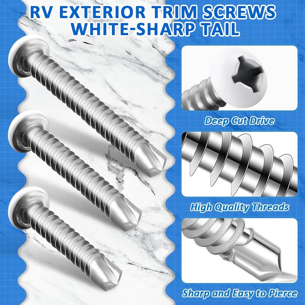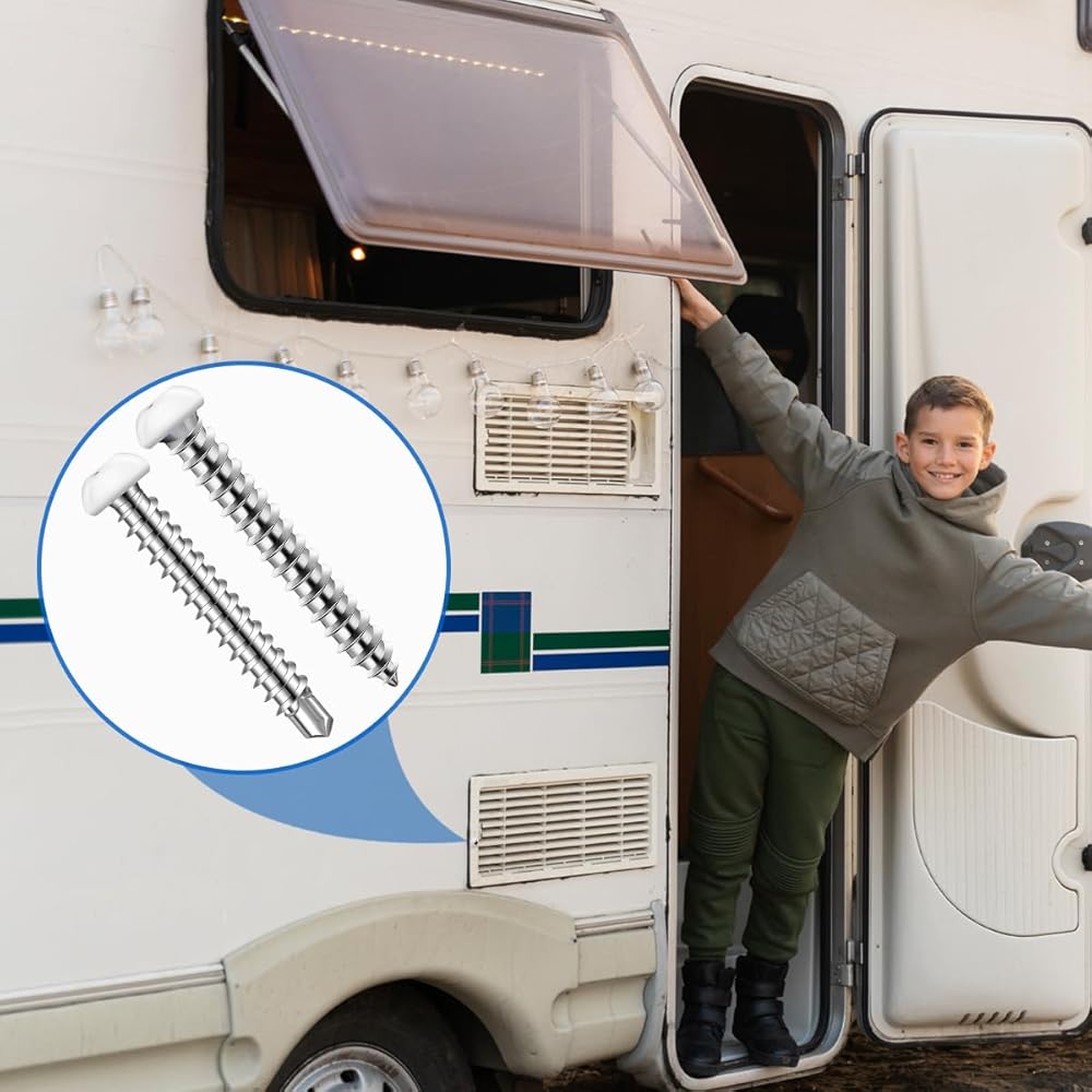 RV White Pan Head Screws:These pan head screws are made of stainless steel material, galvanizing process and head with white coating, which are sturdy and solid, hard to deform or bend, and can be used for a long time.