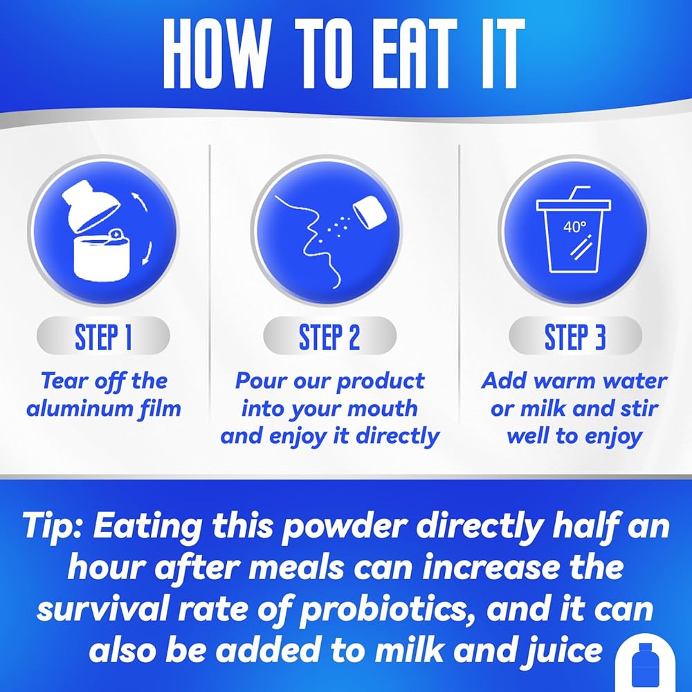 استخدام متعدد الاستخدامات: استمتع بمرونة تناول زجاجة بروبيوتيك من ليتل بلو بوتل واحدة في كل مرة أو مزجها مع مشروبك المفضل مثل الحليب أو العصير أو الطعام السائل. يتناسب بسلاسة مع روتينك اليومي دون التضحية بالفعالية. استمتع بتجربة دمج البروبيوتيك في نمط حياتك.