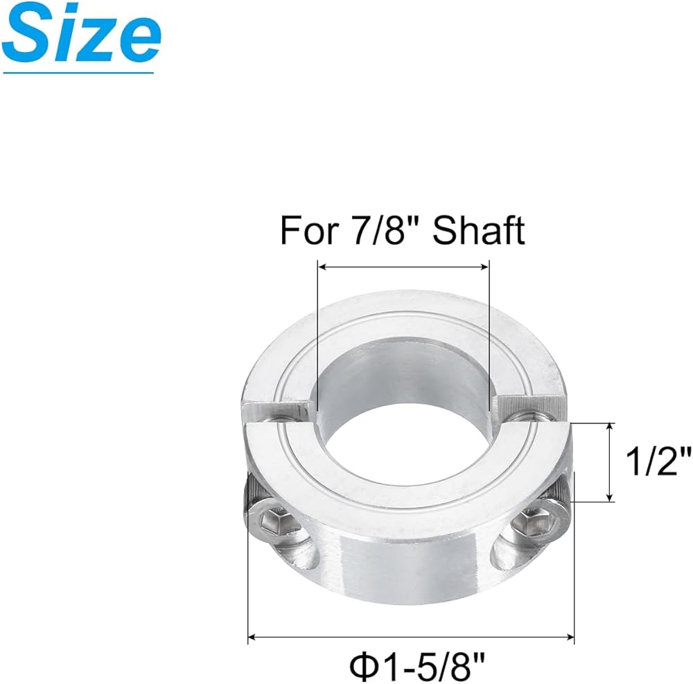 • Size - 7/8 inch split shaft locking collars, 1-5/8 inch outside diameter, 1/2 inch thickness.