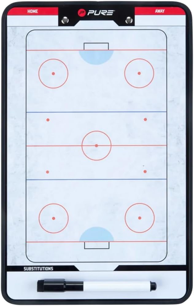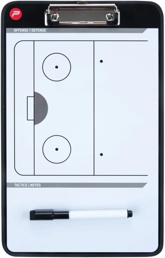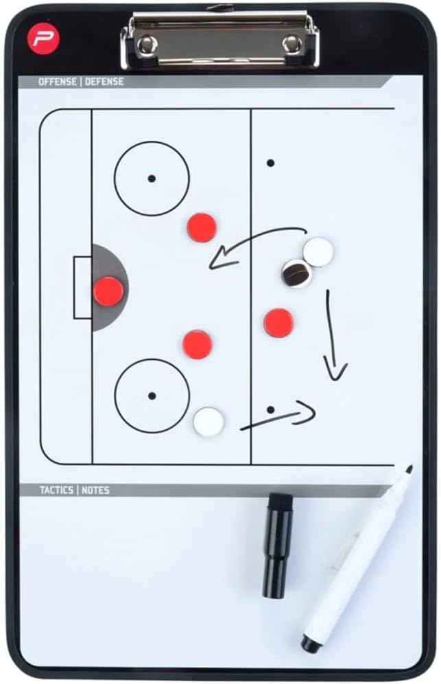 Pure2Improve coach board ice hockey. Use this double-sided Pure2Improve magnetic, dry-erase, coach-board to align your team and track your stats. One side includes a full court/field for diagramming plays, while the other side allows you to set up plays using the White and red round magnets, and allows you to track fouls, timeout, and matchups. This helps you to communicate better and faster what you want to make clear to your team. You can also write down key-points for everybody to remember. The coach-boards are made of lightweight plastic and include a whiteboard-marker (easy to erase) and magnets.
