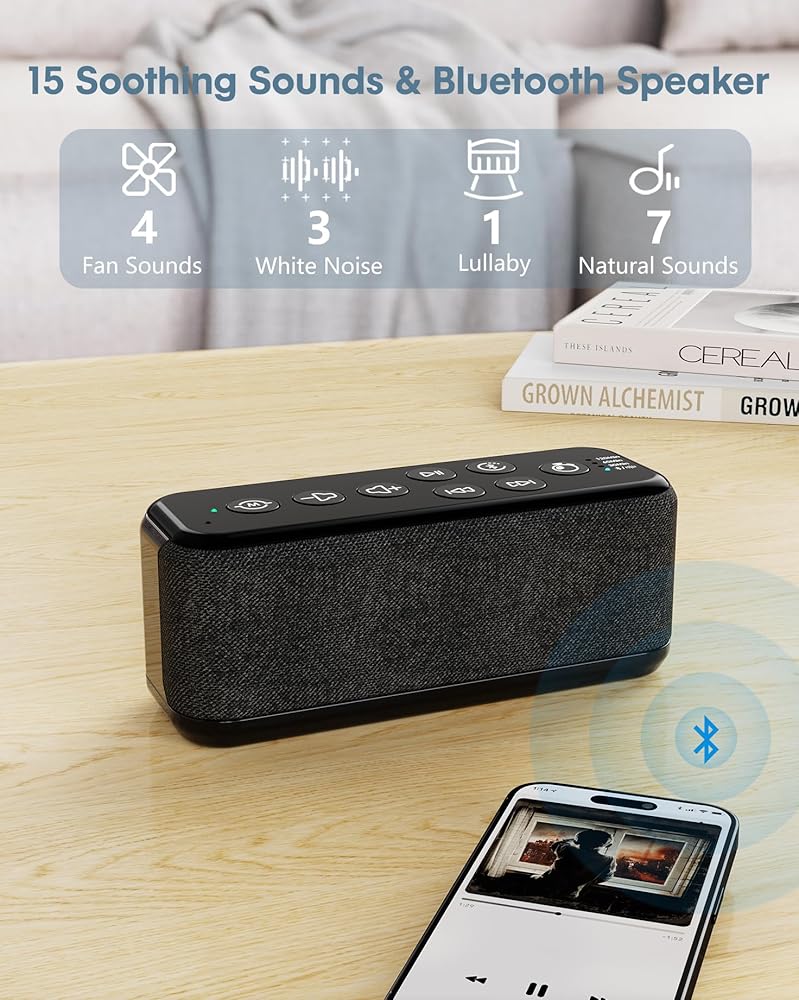 【جهاز صوت مع مكبر صوت بلوتوث 】- تم تصميم جهاز الصوت هذا باستخدام بلوتوث 5.0، ويمكن لآلة الصوت هذه الاتصال بهاتفك الذكي بسرعة وثبات. يمكنك إقرانه لاسلكيًا بهاتفك المحمول أو الكمبيوتر الشخصي واختيار أصوات الضوضاء البيضاء المفضلة لديك أو أصوات الطبيعة أو أي نمط من الموسيقى أو الكتب الصوتية من الشبكة غير المحدودة. استمتع بأصوات الستيريو الواضحة واسترخي.