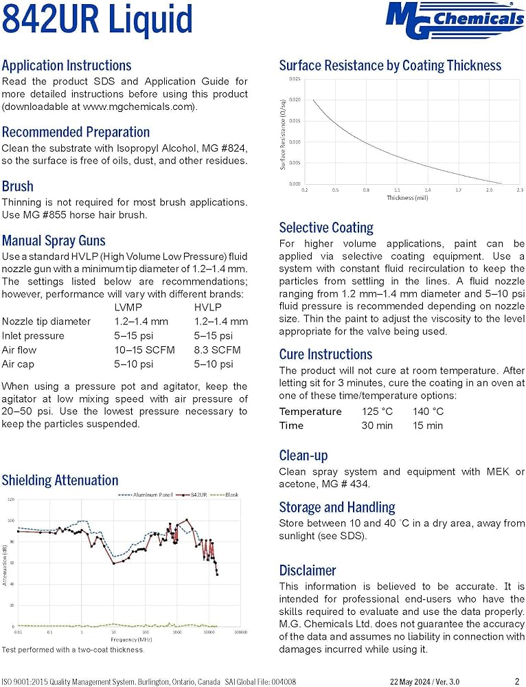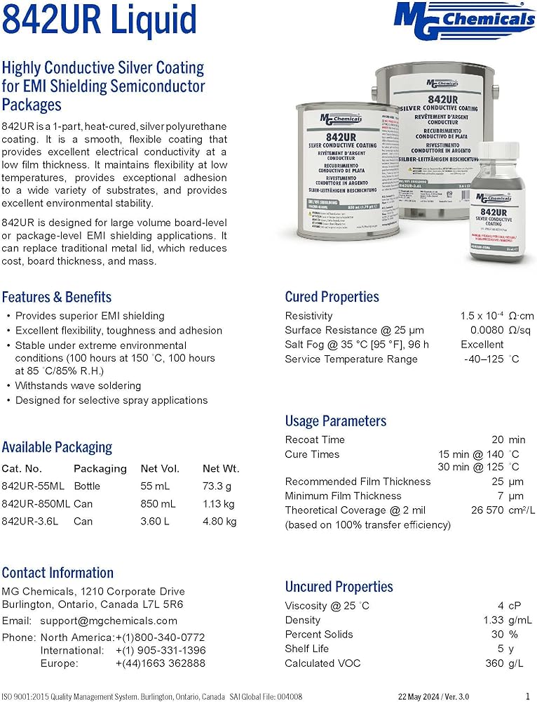 This package level EMI shielding coating is a 1-part, heat-cured, silver polyurethane that is smooth, highly flexible, extremely durable, and provides excellent electrical conductivity at a low film thickness. It maintains flexibility at low temperatures, provides exceptional adhesion to a wide variety of substrates, and provides excellent environmental stability. 842UR is a conductive coating designed for large volume board-level or package-level EMI shielding applications. It can replace traditional metal lid, which reduces cost, board thickness, and mass.This coating will survive wave soldering. We have a 2-part epoxy alternative that will also do so. For post-soldering or device level applications we offer a 1-part acrylic alterative, as well as a water-based alternative for shielding homes or workplaces from EMI. WARNING! This product can expose you to chemicals including methyl isobutyl ketone and cumene, which are known to the State of California to cause cancer and birth defects or other reproductive harm. For more information go to www.P65Warnings.ca.gov.
