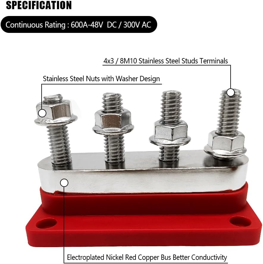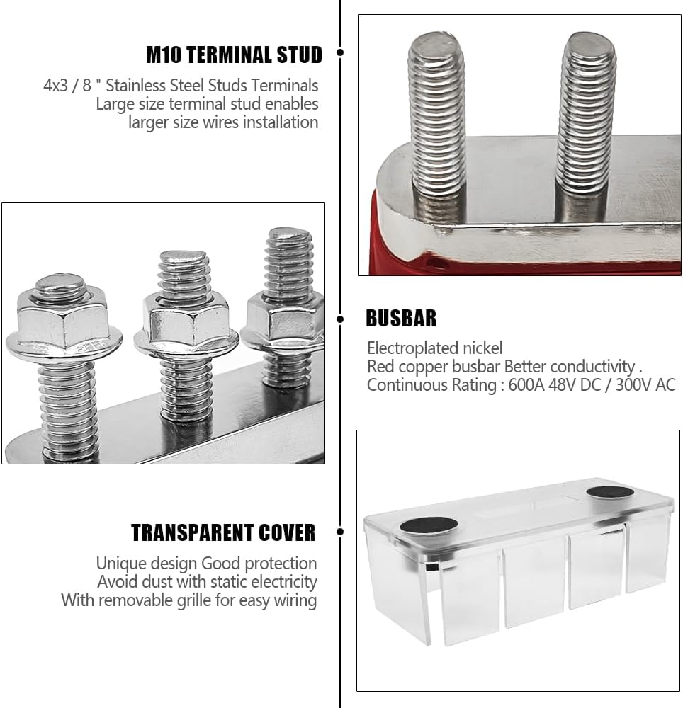 Specifications: High current 600A battery bus bar, 4 M10 3/8" post, working voltage 12V, 24V, 48V, continuous rating 600Amp DC
