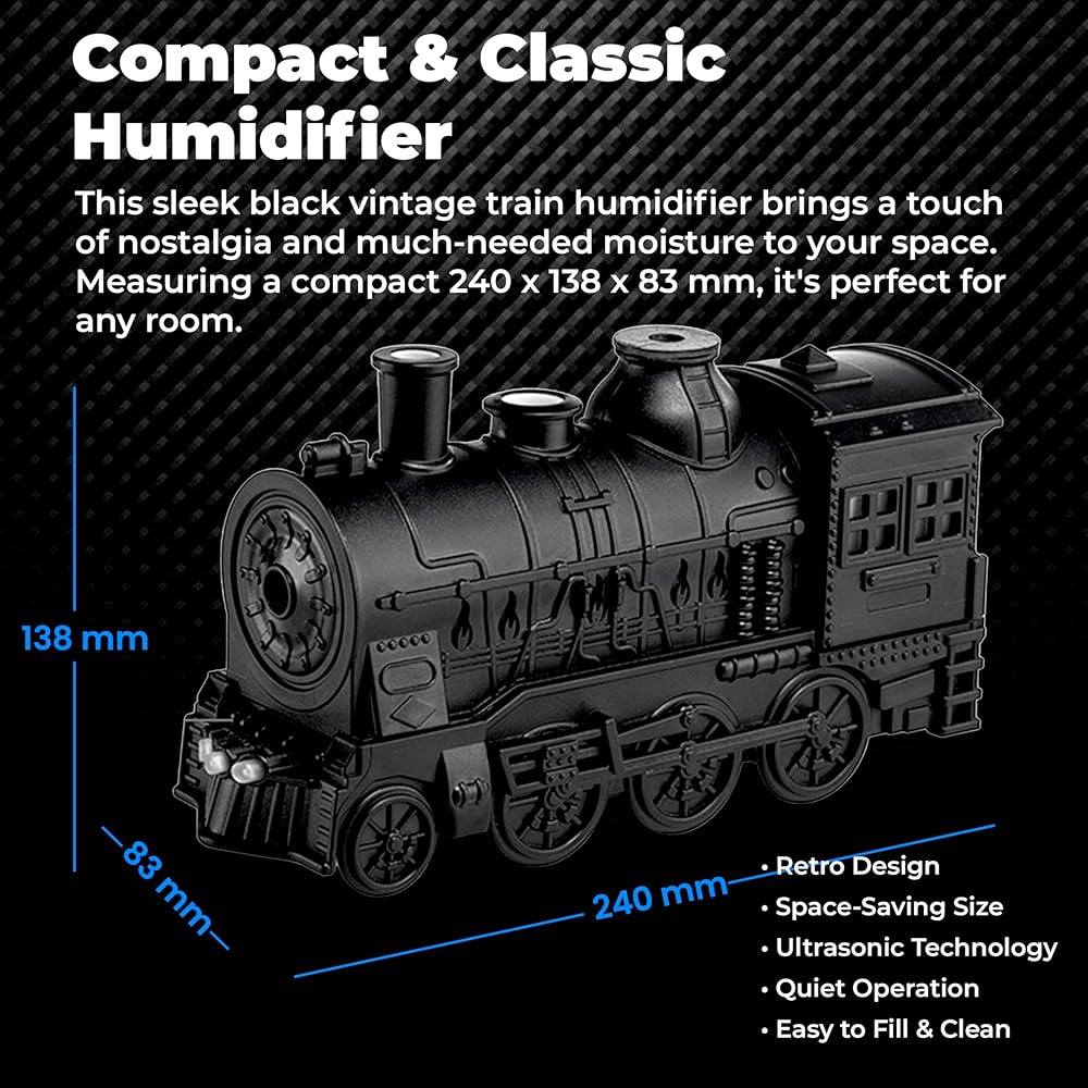 تصميم على الطراز القديم: يمزج مرطب OMEO Black Small Train بين سحر الحنين والوظائف الحديثة، مما يوفر مظهرًا قديمًا فريدًا يعيد الشعور بالأزمنة القديمة. قطعة ديكور مثالية مع فوائد إضافية للعلاج العطري.
