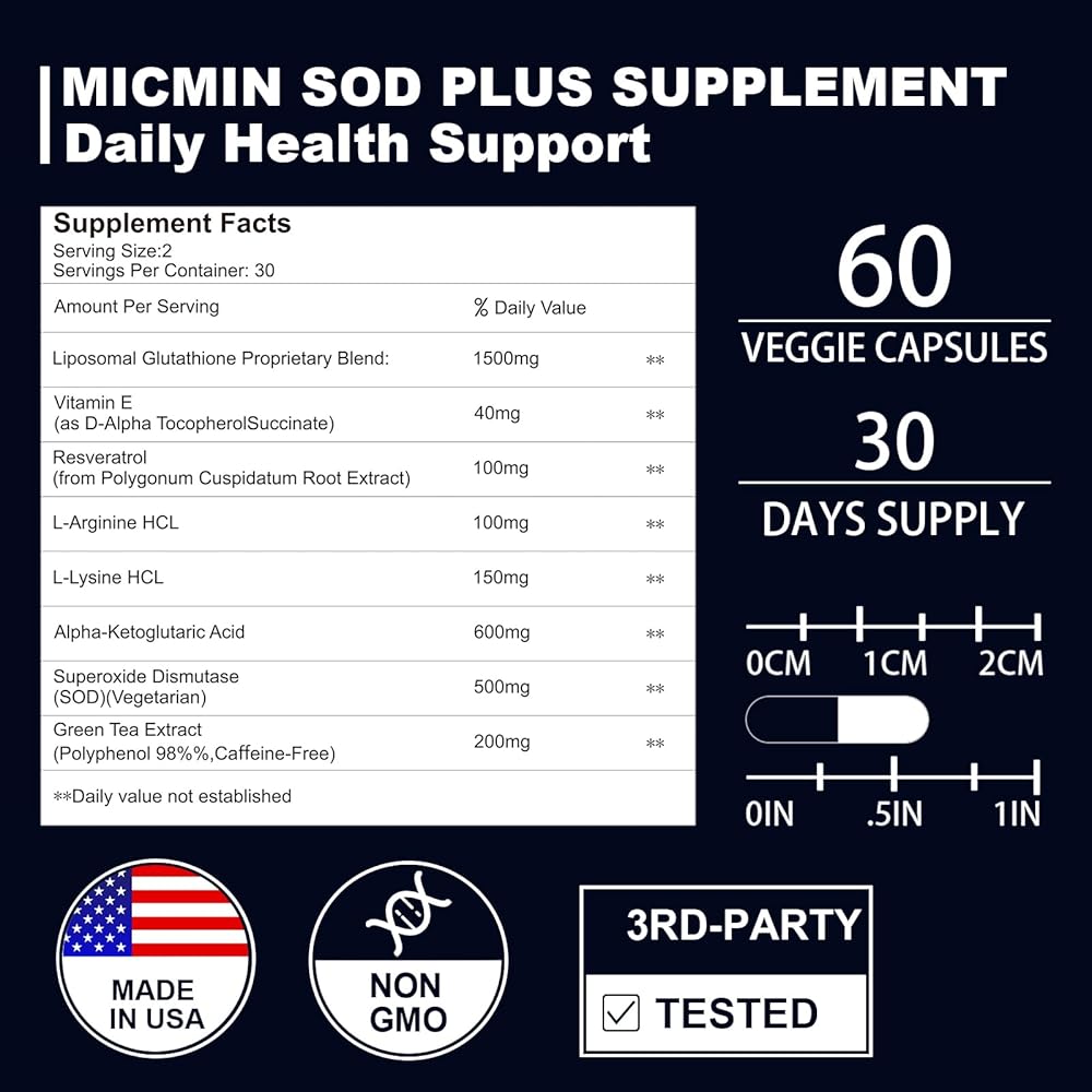 تركيبة فاخرة مضادة للأكسدة: يحتوي مكملنا المضاد للأكسدة على 500 مجم من ديسميوتاز الفائق أكسيد (SOD)، 1500 مجم الجلوتاثيون الشحمي، 150 مجم إل-ليسين، 100 مجم إل-أرجينين، 600 مجم AKG (ألفا-كيتوجلوتارات)، 200 مجم مستخلص الشاي الأخضر، 100 مجم ريسفيراترول وفيتامين هـ. SOD plus يقاوم أضرار الجذور الحرة ويحمي الخلايا من الأضرار التأكسدية.