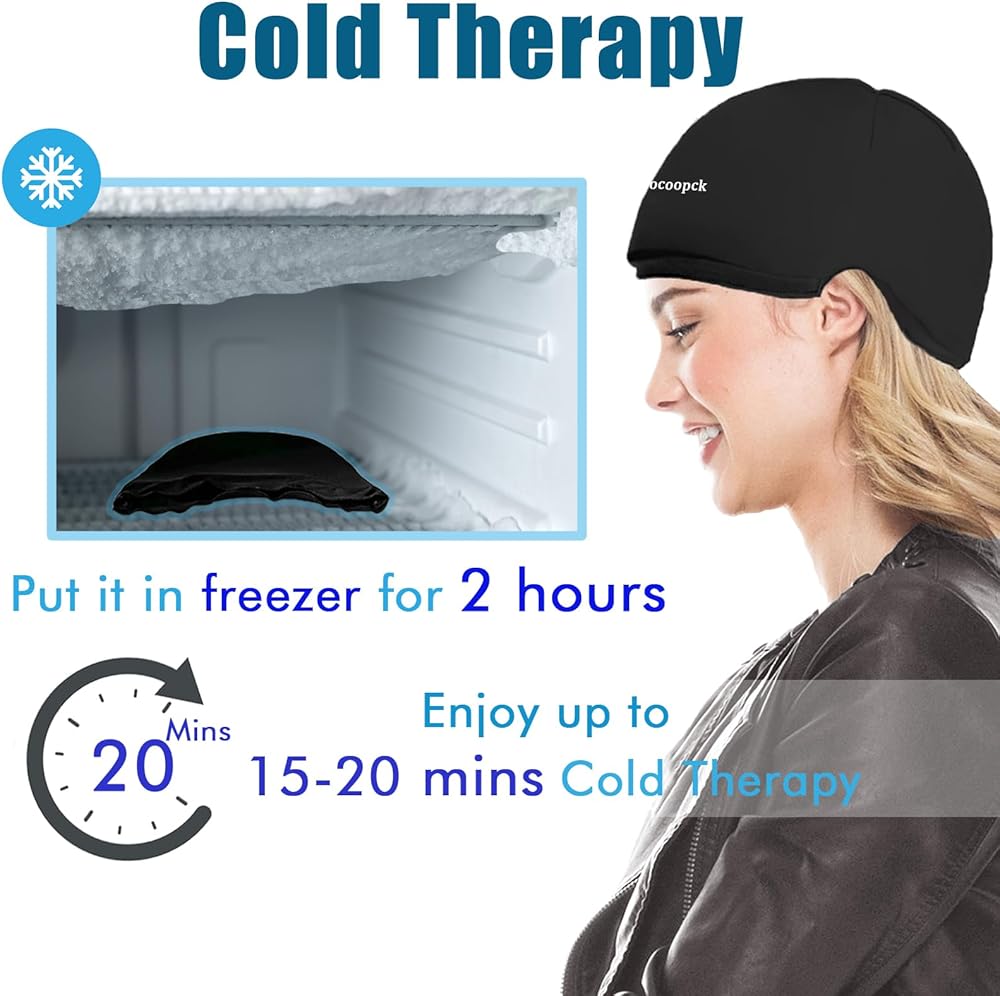 علاج بارد يدوم طويلاً: احتفظ بغطاء الصداع النصفي البارد القابل لإعادة الاستخدام في الفريزر لمدة ساعتين على الأقل وهو جاهز للضغط البارد لمدة 15-20 دقيقة. سهلة الاستخدام والحمل، لا حاجة للتلاعب بعدة عبوات ثلج، قل وداعًا لفافة الرأس العادية غير المريحة.