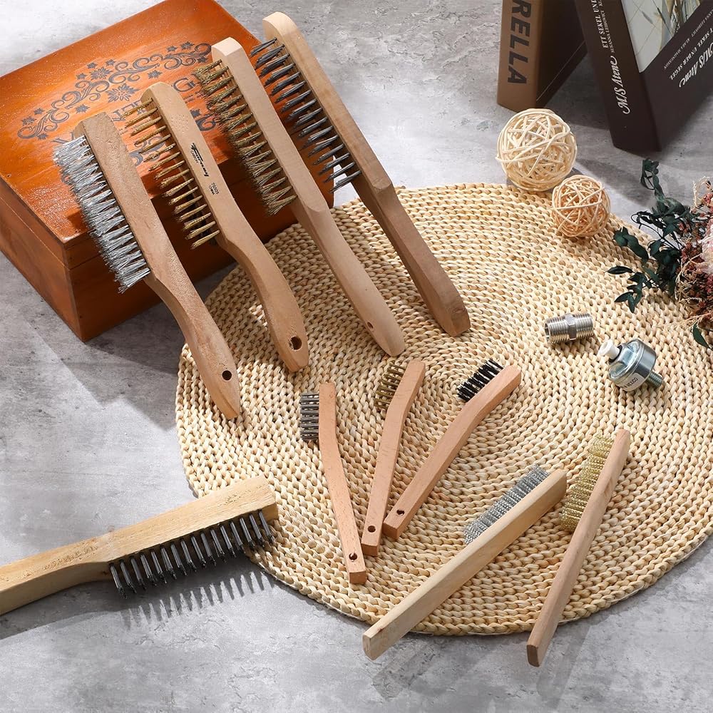This metal brush set comes in a wide variety of beautiful designs and assortments. The wire material, which provides durability and powerful scrubbing facilities, is suitable for tough stains and tough to reach spaces. The wood handle adds an aesthetic appearance to the brush.
