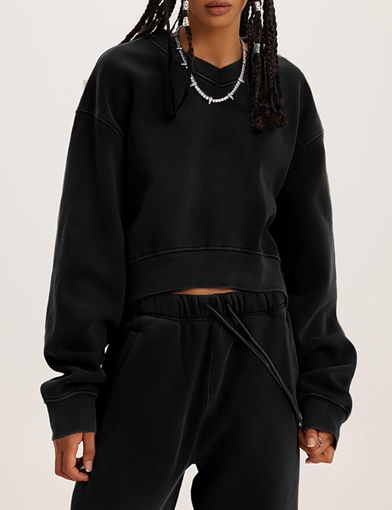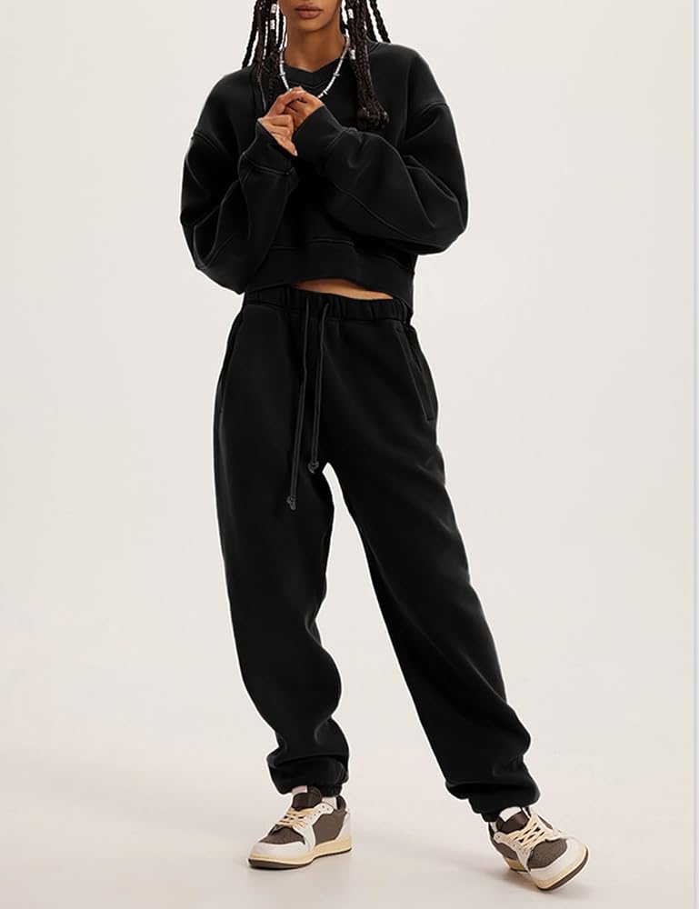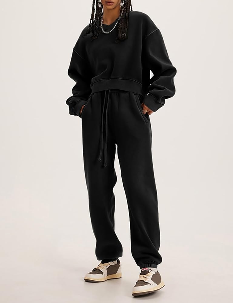 المناسبات: بدلة رياضية كبيرة الحجم مكونة من قطعتين، تتميز بكنزة صوفية قصيرة وبنطلون ركض مطابق. سواء كان ذلك في المدرسة أو صالة الألعاب الرياضية أو الاستراحة غير الرسمية أو في المنزل، فإن هذه الملابس مثالية لأي نزهة، حيث تجمع بين الراحة والأناقة.
